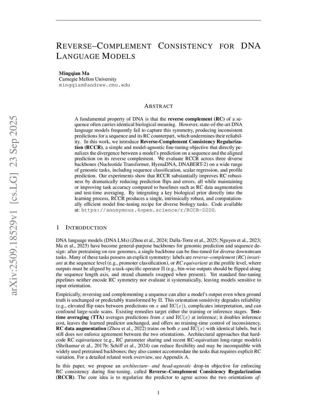 A fundamental property of DNA is that the reverse complement (RC) of a sequence often carries identical biological meaning. However, state-of-the-art DNA language models frequently fail to capture this symmetry, producing inconsistent predictions for a sequence and its RC counterpart, which undermines their reliability. In this work, we introduce Reverse-Complement Consistency Regularization (RCCR), a simple and model-agnostic fine-tuning objective that directly penalizes the divergence between a model's prediction on a sequence and the aligned prediction on its reverse complement. We evaluate RCCR across three diverse backbones (Nucleotide Transformer, HyenaDNA, DNABERT-2) on a wide range of genomic tasks, including sequence classification, scalar regression, and profile prediction. Our experiments show that RCCR substantially improves RC robustness by dramatically reducing prediction flips and errors, all while maintaining or improving task accuracy compared to baselines such as RC data augmentation and test-time averaging. By integrating a key biological prior directly into the learning process, RCCR produces a single, intrinsically robust, and computationally efficient model fine-tuning recipe for diverse biology tasks.