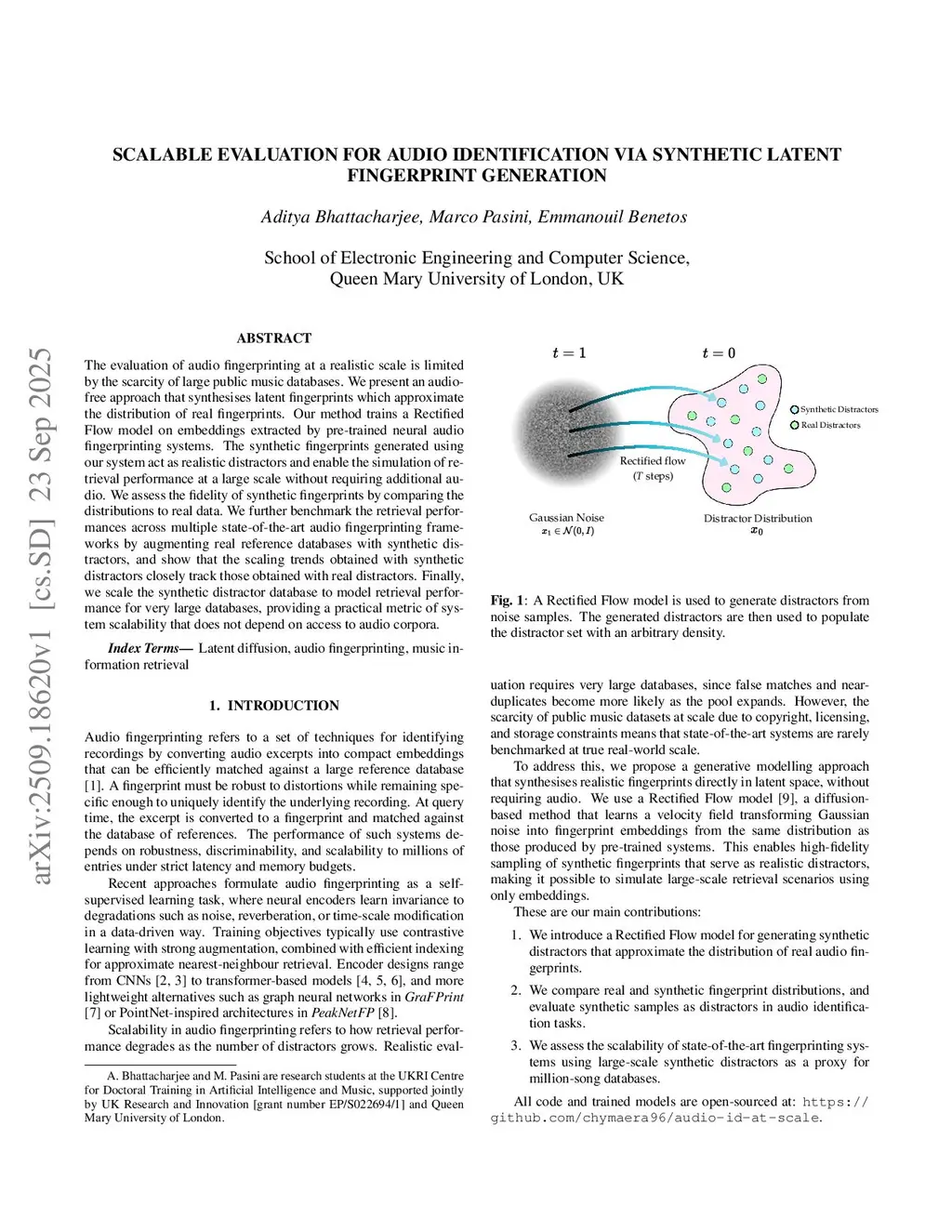 The evaluation of audio fingerprinting at a realistic scale is limited by the scarcity of large public music databases. We present an audio-free approach that synthesises latent fingerprints which approximate the distribution of real fingerprints. Our method trains a Rectified Flow model on embeddings extracted by pre-trained neural audio fingerprinting systems. The synthetic fingerprints generated using our system act as realistic distractors and enable the simulation of retrieval performance at a large scale without requiring additional audio. We assess the fidelity of synthetic fingerprints by comparing the distributions to real data. We further benchmark the retrieval performances across multiple state-of-the-art audio fingerprinting frameworks by augmenting real reference databases with synthetic distractors, and show that the scaling trends obtained with synthetic distractors closely track those obtained with real distractors. Finally, we scale the synthetic distractor database to model retrieval performance for very large databases, providing a practical metric of system scalability that does not depend on access to audio corpora.