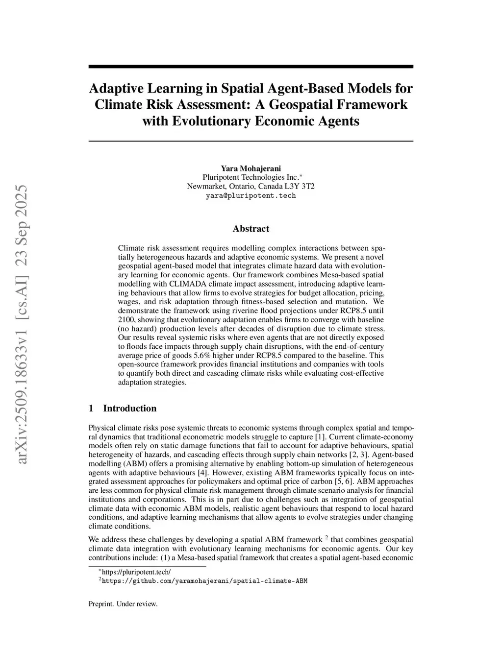Climate risk assessment requires modelling complex interactions between spatially heterogeneous hazards and adaptive economic systems. We present a novel geospatial agent-based model that integrates climate hazard data with evolutionary learning for economic agents. Our framework combines geospatial agent-based modelling with asset-level damage functions, featuring an illustrative three-sector economy (commodity, manufacturing, retail) with adaptive learning behaviours that allow firms to evolve strategies for budget allocation, pricing, wages, and risk adaptation through fitness-based selection and mutation. We demonstrate the framework using riverine flood projections under RCP8.5 until 2100, comparing four scenarios: baseline and hazard conditions with and without evolutionary learning. Our results show that increasingly frequent and intense acute hazards lower firm production levels, liquidity, and capital, while increasing the prices of goods and unemployment. The framework reveals systemic risks where even agents not directly exposed to floods face impacts through supply chain disruptions. Importantly, evolutionary adaptation enables firms to maintain higher production, capital, liquidity, wages and employment levels while keeping prices lower compared to non-learning counterparts. This open-source framework provides financial institutions and companies with tools to quantify both direct and cascading climate risks while evaluating cost-effective adaptation strategies.