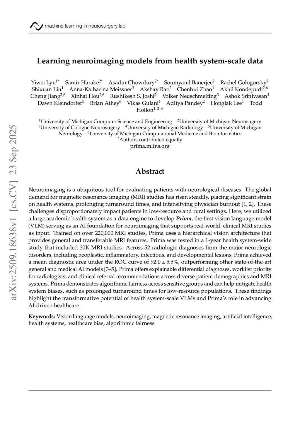 Neuroimaging is a ubiquitous tool for evaluating patients with neurological diseases. The global demand for magnetic resonance imaging (MRI) studies has risen steadily, placing significant strain on health systems, prolonging turnaround times, and intensifying physician burnout. These challenges disproportionately impact patients in low-resource and rural settings. Here, we utilized a large academic health system as a data engine to develop Prima, the first vision language model (VLM) serving as an AI foundation for neuroimaging that supports real-world, clinical MRI studies as input. Trained on over 220,000 MRI studies, Prima uses a hierarchical vision architecture that provides general and transferable MRI features. Prima was tested in a 1-year health system-wide study that included 30K MRI studies. Across 52 radiologic diagnoses from the major neurologic disorders, including neoplastic, inflammatory, infectious, and developmental lesions, Prima achieved a mean diagnostic area under the ROC curve of 92.0, outperforming other state-of-the-art general and medical AI models. Prima offers explainable differential diagnoses, worklist priority for radiologists, and clinical referral recommendations across diverse patient demographics and MRI systems. Prima demonstrates algorithmic fairness across sensitive groups and can help mitigate health system biases, such as prolonged turnaround times for low-resource populations. These findings highlight the transformative potential of health system-scale VLMs and Prima's role in advancing AI-driven healthcare.