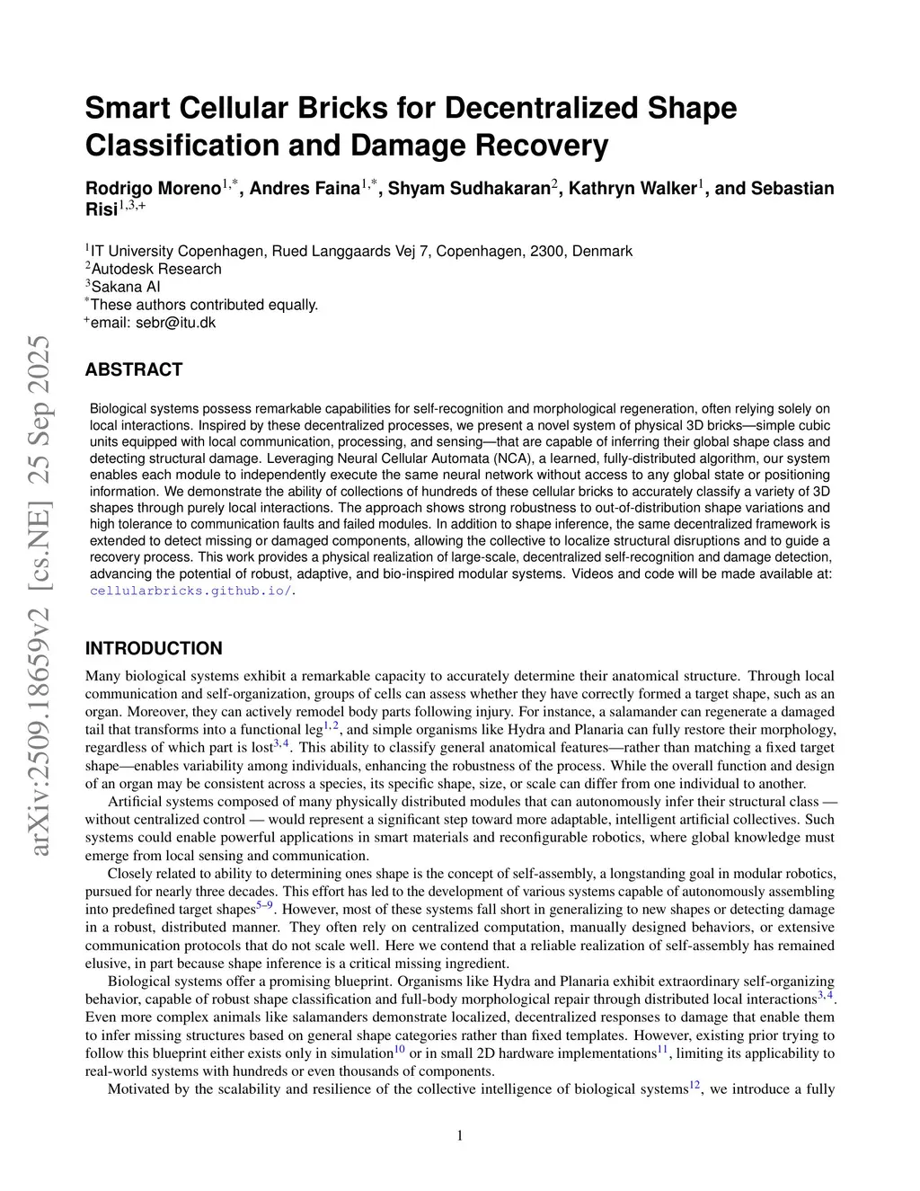 Biological systems possess remarkable capabilities for self-recognition and morphological regeneration, often relying solely on local interactions. Inspired by these decentralized processes, we present a novel system of physical 3D bricks--simple cubic units equipped with local communication, processing, and sensing--that are capable of inferring their global shape class and detecting structural damage. Leveraging Neural Cellular Automata (NCA), a learned, fully-distributed algorithm, our system enables each module to independently execute the same neural network without access to any global state or positioning information. We demonstrate the ability of collections of hundreds of these cellular bricks to accurately classify a variety of 3D shapes through purely local interactions. The approach shows strong robustness to out-of-distribution shape variations and high tolerance to communication faults and failed modules. In addition to shape inference, the same decentralized framework is extended to detect missing or damaged components, allowing the collective to localize structural disruptions and to guide a recovery process. This work provides a physical realization of large-scale, decentralized self-recognition and damage detection, advancing the potential of robust, adaptive, and bio-inspired modular systems. Videos and code will be made available at:this https URL