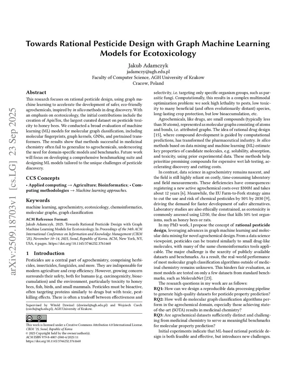 This research focuses on rational pesticide design, using graph machine learning to accelerate the development of safer, eco-friendly agrochemicals, inspired by in silico methods in drug discovery. With an emphasis on ecotoxicology, the initial contributions include the creation of ApisTox, the largest curated dataset on pesticide toxicity to honey bees. We conducted a broad evaluation of machine learning (ML) models for molecular graph classification, including molecular fingerprints, graph kernels, GNNs, and pretrained transformers. The results show that methods successful in medicinal chemistry often fail to generalize to agrochemicals, underscoring the need for domain-specific models and benchmarks. Future work will focus on developing a comprehensive benchmarking suite and designing ML models tailored to the unique challenges of pesticide discovery.