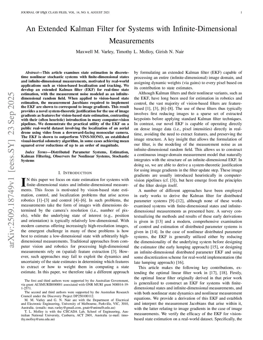 This article examines state estimation in discrete-time nonlinear stochastic systems with finite-dimensional states and infinite-dimensional measurements, motivated by real-world applications such as vision-based localization and tracking. We develop an extended Kalman filter (EKF) for real-time state estimation, with the measurement noise modeled as an infinite-dimensional random field. When applied to vision-based state estimation, the measurement Jacobians required to implement the EKF are shown to correspond to image gradients. This result provides a novel system-theoretic justification for the use of image gradients as features for vision-based state estimation, contrasting with their (often heuristic) introduction in many computer-vision pipelines. We demonstrate the practical utility of the EKF on a public real-world dataset involving the localization of an aerial drone using video from a downward-facing monocular camera. The EKF is shown to outperform VINS-MONO, an established visual-inertial odometry algorithm, in some cases achieving mean squared error reductions of up to an order of magnitude.