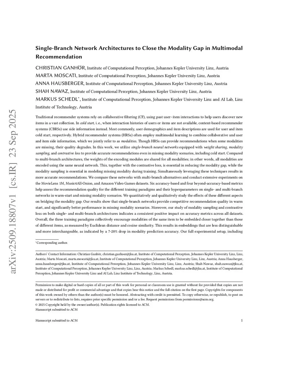 Traditional recommender systems rely on collaborative filtering, using past user-item interactions to help users discover new items in a vast collection. In cold start, i.e., when interaction histories of users or items are not available, content-based recommender systems use side information instead. Hybrid recommender systems (HRSs) often employ multimodal learning to combine collaborative and side information, which we jointly refer to as modalities. Though HRSs can provide recommendations when some modalities are missing, their quality degrades. In this work, we utilize single-branch neural networks equipped with weight sharing, modality sampling, and contrastive loss to provide accurate recommendations even in missing modality scenarios by narrowing the modality gap. We compare these networks with multi-branch alternatives and conduct extensive experiments on three datasets. Six accuracy-based and four beyond-accuracy-based metrics help assess the recommendation quality for the different training paradigms and their hyperparameters in warm-start and missing modality scenarios. We quantitatively and qualitatively study the effects of these different aspects on bridging the modality gap. Our results show that single-branch networks achieve competitive performance in warm-start scenarios and are significantly better in missing modality settings. Moreover, our approach leads to closer proximity of an item's modalities in the embedding space. Our full experimental setup is available atthis https URL.