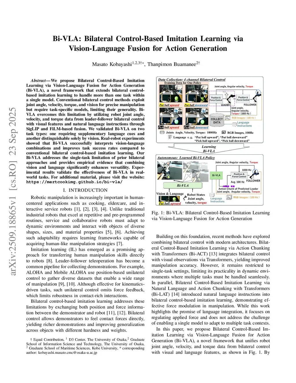 Bi-VLA: Bilateral Control-Based Imitation Learning via Vision-Language Fusion for Action Generation