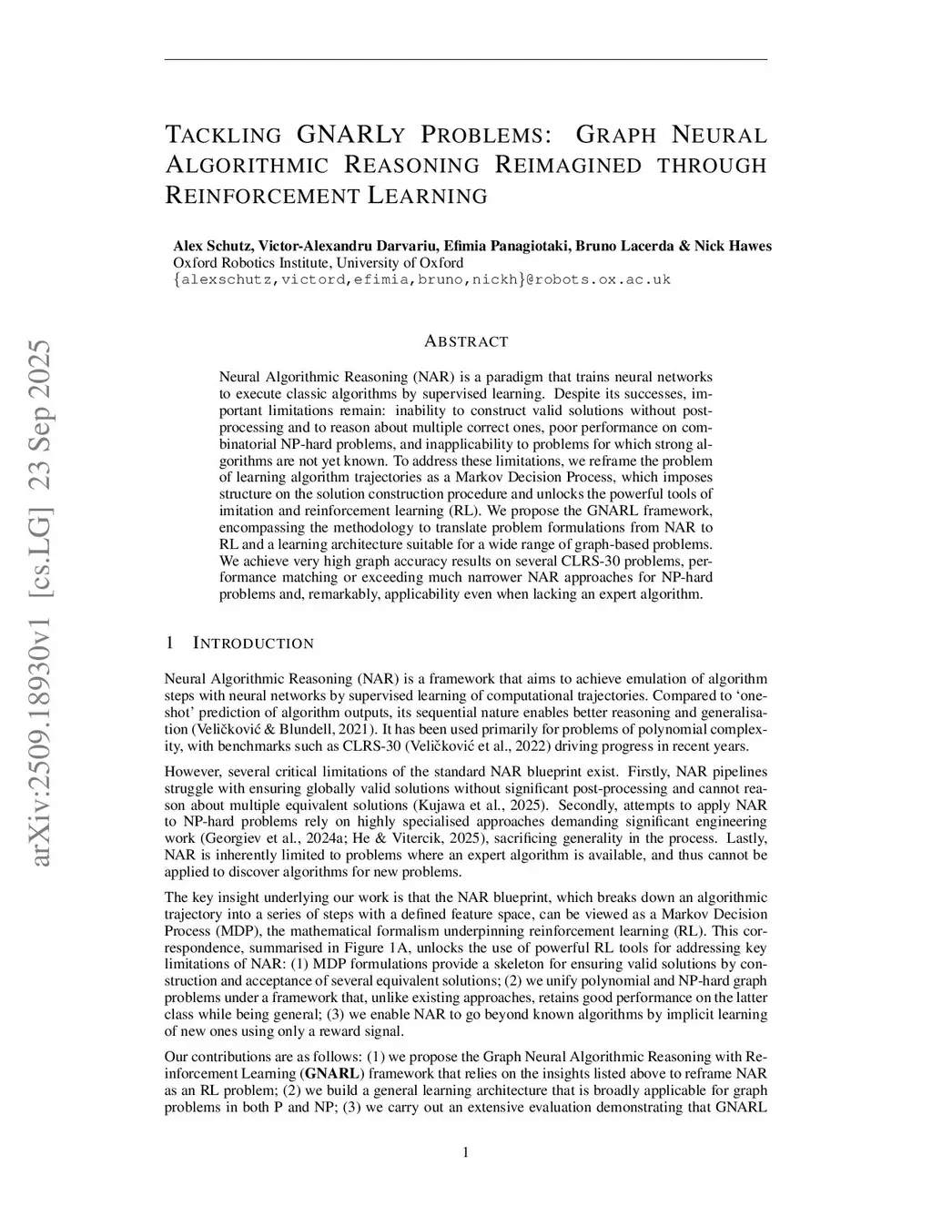 Neural Algorithmic Reasoning (NAR) is a paradigm that trains neural networks to execute classic algorithms by supervised learning. Despite its successes, important limitations remain: inability to construct valid solutions without post-processing and to reason about multiple correct ones, poor performance on combinatorial NP-hard problems, and inapplicability to problems for which strong algorithms are not yet known. To address these limitations, we reframe the problem of learning algorithm trajectories as a Markov Decision Process, which imposes structure on the solution construction procedure and unlocks the powerful tools of imitation and reinforcement learning (RL). We propose the GNARL framework, encompassing the methodology to translate problem formulations from NAR to RL and a learning architecture suitable for a wide range of graph-based problems. We achieve very high graph accuracy results on several CLRS-30 problems, performance matching or exceeding much narrower NAR approaches for NP-hard problems and, remarkably, applicability even when lacking an expert algorithm.