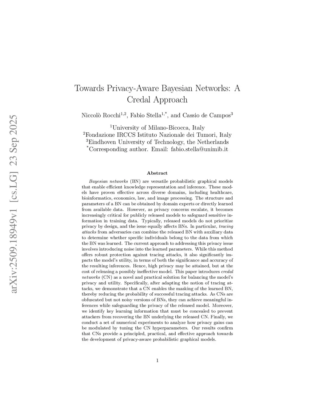 Bayesian networks (BN) are probabilistic graphical models that enable efficient knowledge representation and inference. These have proven effective across diverse domains, including healthcare, bioinformatics and economics. The structure and parameters of a BN can be obtained by domain experts or directly learned from available data. However, as privacy concerns escalate, it becomes increasingly critical for publicly released models to safeguard sensitive information in training data. Typically, released models do not prioritize privacy by design. In particular, tracing attacks from adversaries can combine the released BN with auxiliary data to determine whether specific individuals belong to the data from which the BN was learned. State-of-the-art protection tecniques involve introducing noise into the learned parameters. While this offers robust protection against tracing attacks, it significantly impacts the model's utility, in terms of both the significance and accuracy of the resulting inferences. Hence, high privacy may be attained at the cost of releasing a possibly ineffective model. This paper introduces credal networks (CN) as a novel solution for balancing the model's privacy and utility. After adapting the notion of tracing attacks, we demonstrate that a CN enables the masking of the learned BN, thereby reducing the probability of successful attacks. As CNs are obfuscated but not noisy versions of BNs, they can achieve meaningful inferences while safeguarding privacy. Moreover, we identify key learning information that must be concealed to prevent attackers from recovering the underlying BN. Finally, we conduct a set of numerical experiments to analyze how privacy gains can be modulated by tuning the CN hyperparameters. Our results confirm that CNs provide a principled, practical, and effective approach towards the development of privacy-aware probabilistic graphical models.
