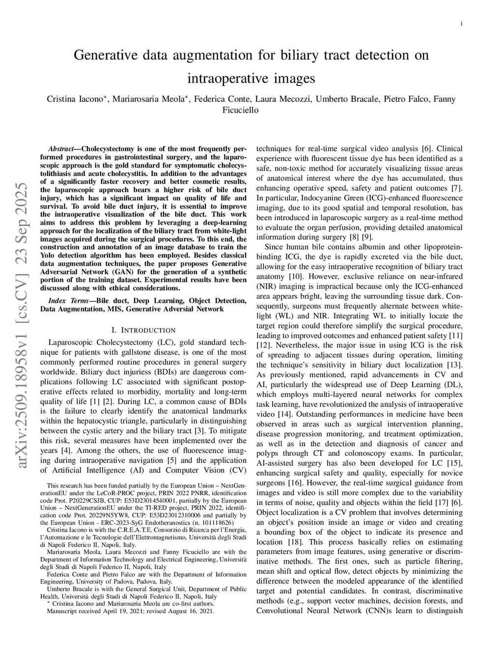 Cholecystectomy is one of the most frequently performed procedures in gastrointestinal surgery, and the laparoscopic approach is the gold standard for symptomatic cholecystolithiasis and acute cholecystitis. In addition to the advantages of a significantly faster recovery and better cosmetic results, the laparoscopic approach bears a higher risk of bile duct injury, which has a significant impact on quality of life and survival. To avoid bile duct injury, it is essential to improve the intraoperative visualization of the bile duct. This work aims to address this problem by leveraging a deep-learning approach for the localization of the biliary tract from white-light images acquired during the surgical procedures. To this end, the construction and annotation of an image database to train the Yolo detection algorithm has been employed. Besides classical data augmentation techniques, the paper proposes Generative Adversarial Network (GAN) for the generation of a synthetic portion of the training dataset. Experimental results have been discussed along with ethical considerations.