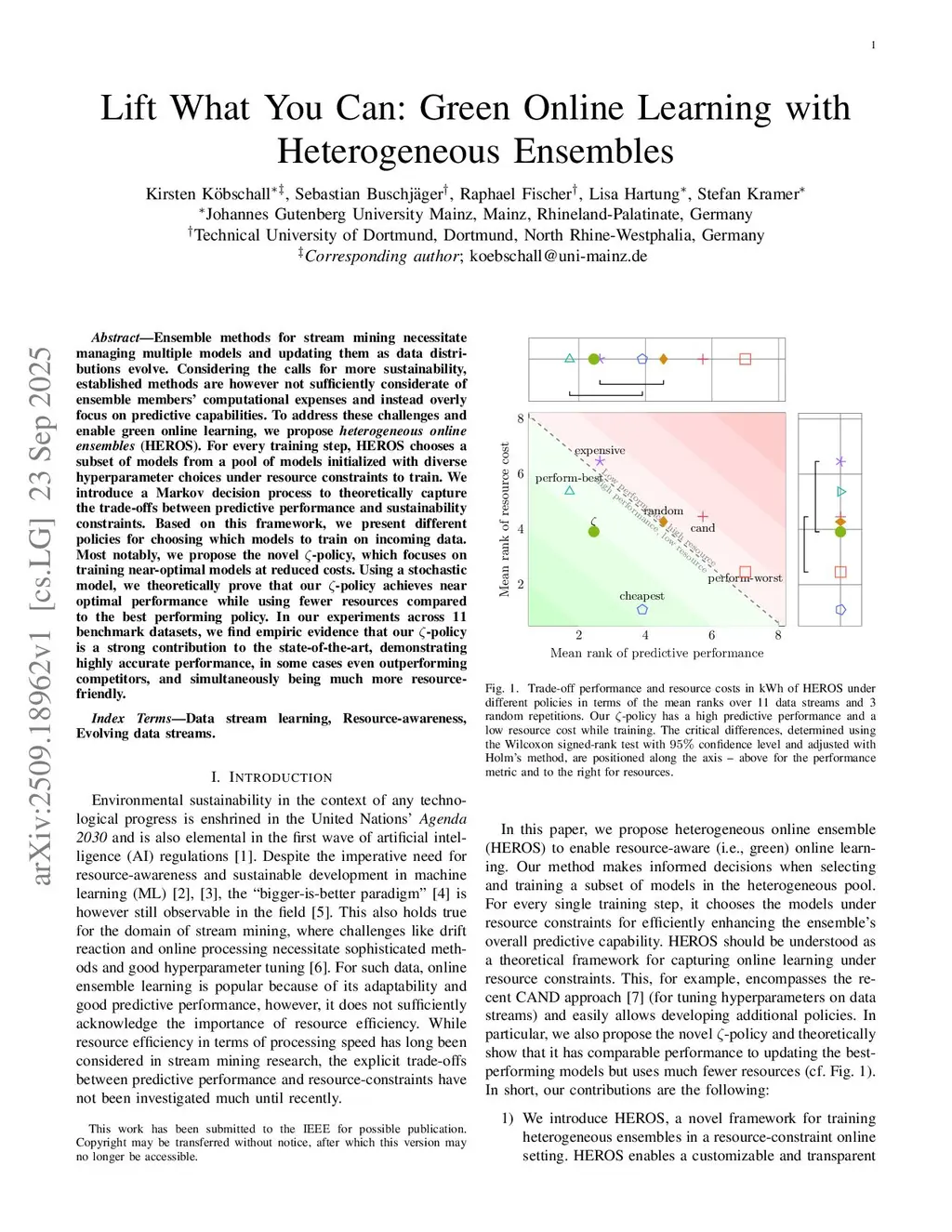Ensemble methods for stream mining necessitate managing multiple models and updating them as data distributions evolve. Considering the calls for more sustainability, established methods are however not sufficiently considerate of ensemble members' computational expenses and instead overly focus on predictive capabilities. To address these challenges and enable green online learning, we propose heterogeneous online ensembles (HEROS). For every training step, HEROS chooses a subset of models from a pool of models initialized with diverse hyperparameter choices under resource constraints to train. We introduce a Markov decision process to theoretically capture the trade-offs between predictive performance and sustainability constraints. Based on this framework, we present different policies for choosing which models to train on incoming data. Most notably, we propose the novel -policy, which focuses on training near-optimal models at reduced costs. Using a stochastic model, we theoretically prove that our -policy achieves near optimal performance while using fewer resources compared to the best performing policy. In our experiments across 11 benchmark datasets, we find empiric evidence that our -policy is a strong contribution to the state-of-the-art, demonstrating highly accurate performance, in some cases even outperforming competitors, and simultaneously being much more resource-friendly.