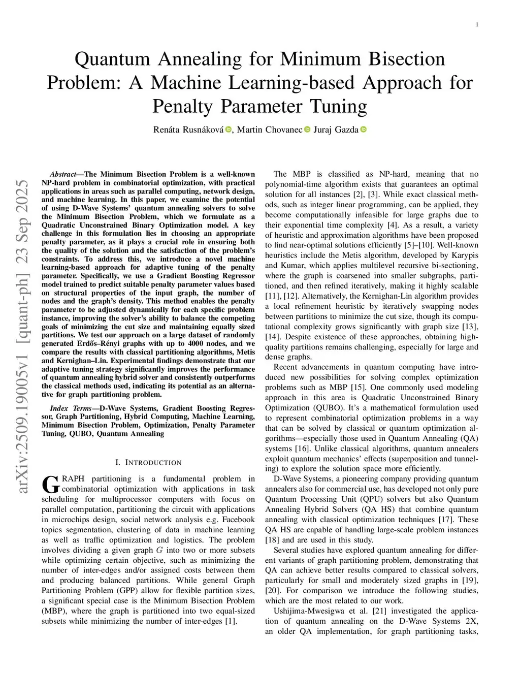 The Minimum Bisection Problem is a well-known NP-hard problem in combinatorial optimization, with practical applications in areas such as parallel computing, network design, and machine learning. In this paper, we examine the potential of using D-Wave Systems' quantum annealing solvers to solve the Minimum Bisection Problem, which we formulate as a Quadratic Unconstrained Binary Optimization model. A key challenge in this formulation lies in choosing an appropriate penalty parameter, as it plays a crucial role in ensuring both the quality of the solution and the satisfaction of the problem's constraints. To address this, we introduce a novel machine learning-based approach for adaptive tuning of the penalty parameter. Specifically, we use a Gradient Boosting Regressor model trained to predict suitable penalty parameter values based on structural properties of the input graph, the number of nodes and the graph's density. This method enables the penalty parameter to be adjusted dynamically for each specific problem instance, improving the solver's ability to balance the competing goals of minimizing the cut size and maintaining equally sized partitions. We test our approach on a large dataset of randomly generated Erdős-Rényi graphs with up to 4,000 nodes, and we compare the results with classical partitioning algorithms, Metis and Kernighan-Lin. Experimental findings demonstrate that our adaptive tuning strategy significantly improves the performance of the quantum annealing hybrid solver and consistently outperforms the classical methods used, indicating its potential as an alternative for the graph partitioning problem.