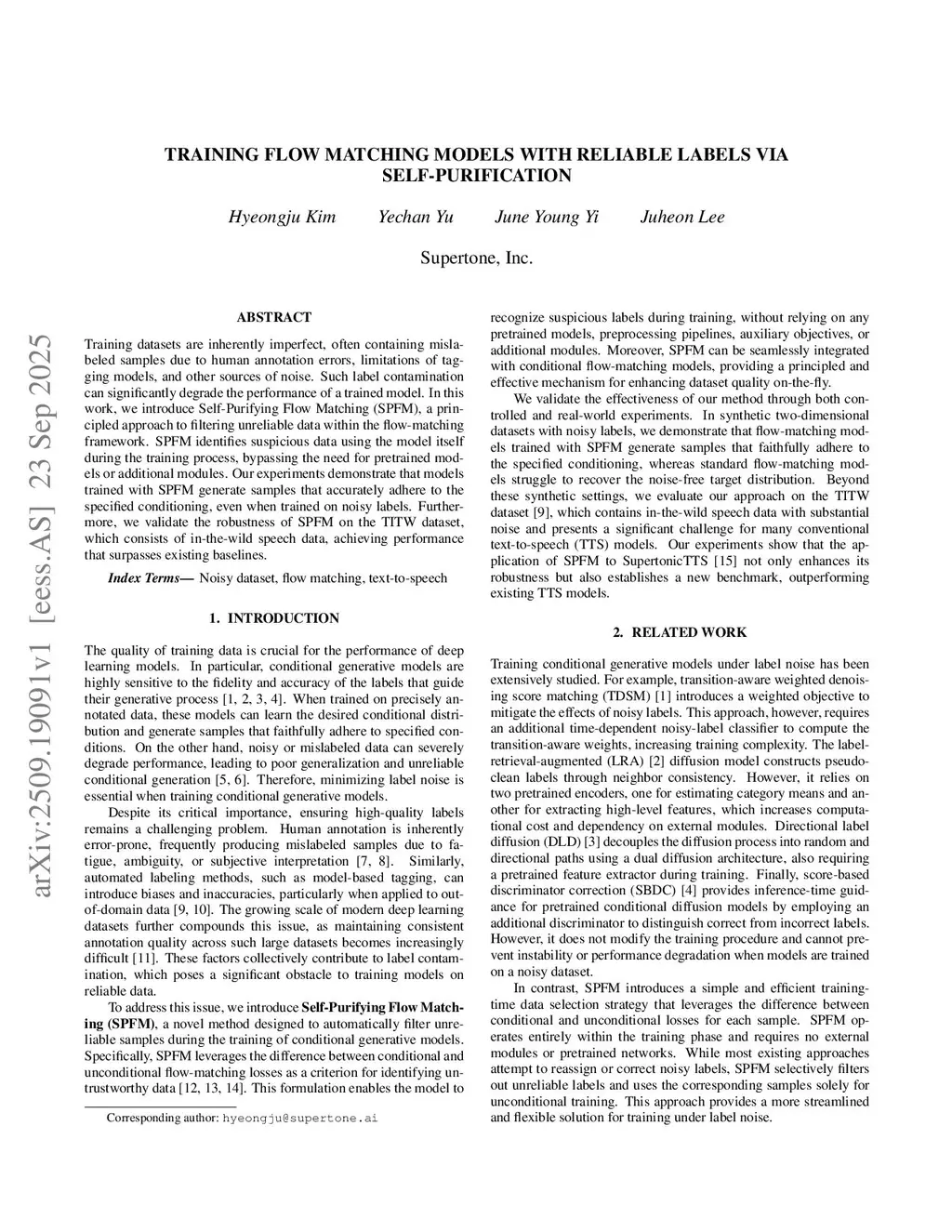 Training datasets are inherently imperfect, often containing mislabeled samples due to human annotation errors, limitations of tagging models, and other sources of noise. Such label contamination can significantly degrade the performance of a trained model. In this work, we introduce Self-Purifying Flow Matching (SPFM), a principled approach to filtering unreliable data within the flow-matching framework. SPFM identifies suspicious data using the model itself during the training process, bypassing the need for pretrained models or additional modules. Our experiments demonstrate that models trained with SPFM generate samples that accurately adhere to the specified conditioning, even when trained on noisy labels. Furthermore, we validate the robustness of SPFM on the TITW dataset, which consists of in-the-wild speech data, achieving performance that surpasses existing baselines.