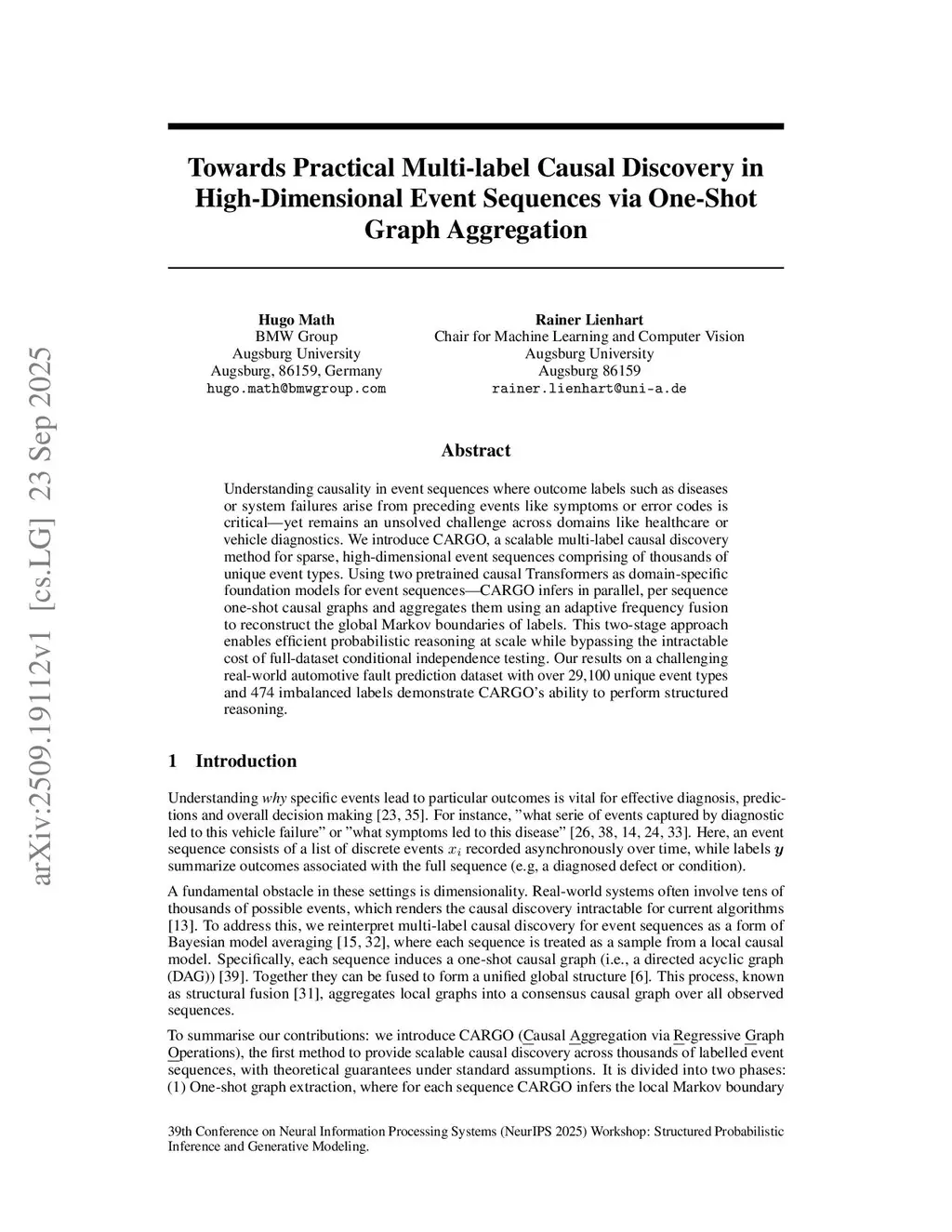 Understanding causality in event sequences where outcome labels such as diseases or system failures arise from preceding events like symptoms or error codes is critical. Yet remains an unsolved challenge across domains like healthcare or vehicle diagnostics. We introduce CARGO, a scalable multi-label causal discovery method for sparse, high-dimensional event sequences comprising of thousands of unique event types. Using two pretrained causal Transformers as domain-specific foundation models for event sequences. CARGO infers in parallel, per sequence one-shot causal graphs and aggregates them using an adaptive frequency fusion to reconstruct the global Markov boundaries of labels. This two-stage approach enables efficient probabilistic reasoning at scale while bypassing the intractable cost of full-dataset conditional independence testing. Our results on a challenging real-world automotive fault prediction dataset with over 29,100 unique event types and 474 imbalanced labels demonstrate CARGO's ability to perform structured reasoning.