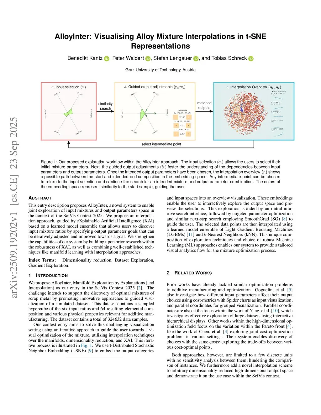 This entry description proposes AlloyInter, a novel system to enable joint exploration of input mixtures and output parameters space in the context of the SciVis Contest 2025. We propose an interpolation approach, guided by eXplainable Artificial Intelligence (XAI) based on a learned model ensemble that allows users to discover input mixture ratios by specifying output parameter goals that can be iteratively adjusted and improved towards a goal. We strengthen the capabilities of our system by building upon prior research within the robustness of XAI, as well as combining well-established techniques like manifold learning with interpolation approaches.