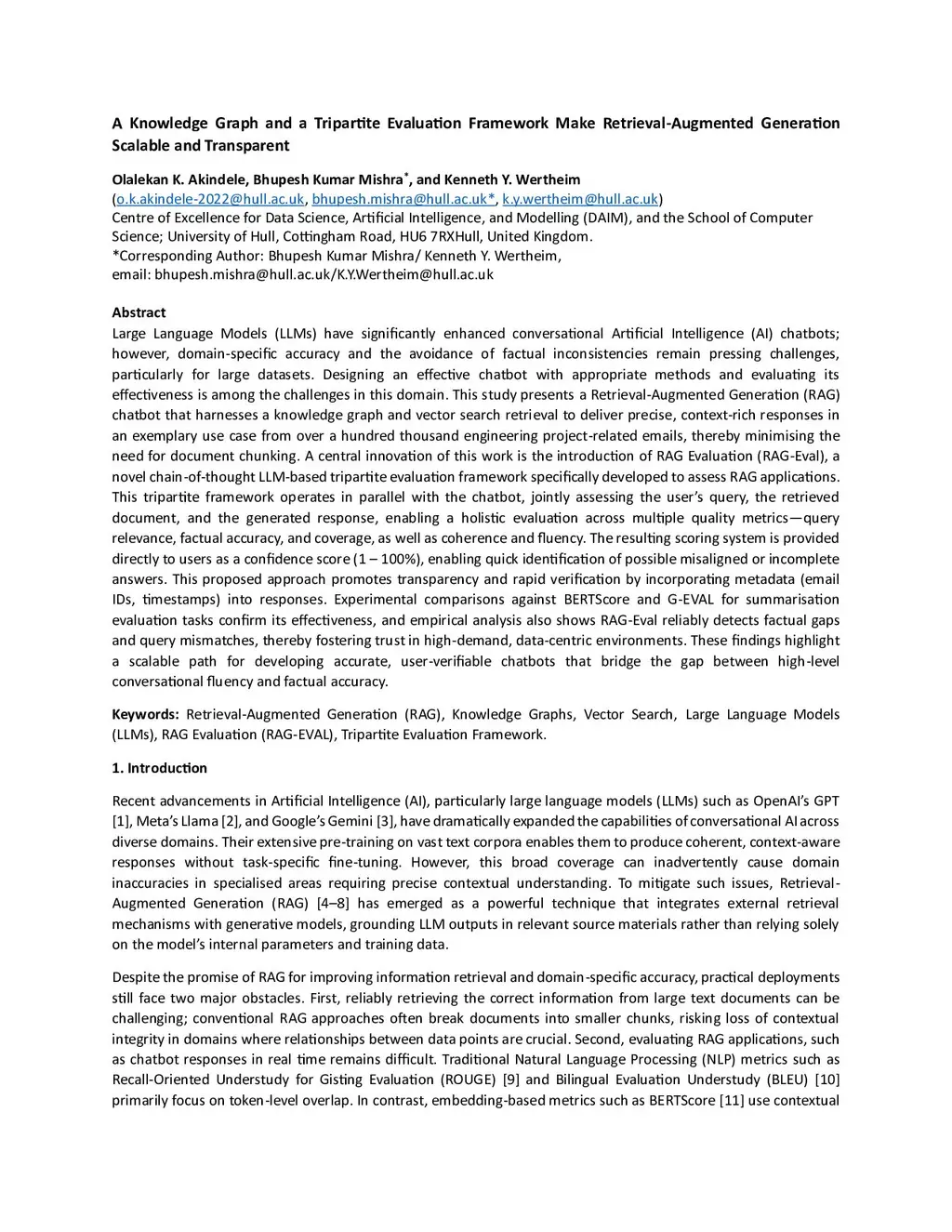 Large Language Models (LLMs) have significantly enhanced conversational Artificial Intelligence(AI) chatbots; however, domain-specific accuracy and the avoidance of factual inconsistencies remain pressing challenges, particularly for large datasets. Designing an effective chatbot with appropriate methods and evaluating its effectiveness is among the challenges in this domain. This study presents a Retrieval Augmented Generation (RAG) chatbot that harnesses a knowledge graph and vector search retrieval to deliver precise, context-rich responses in an exemplary use case from over high-volume engineering project-related emails, thereby minimising the need for document chunking. A central innovation of this work is the introduction of RAG Evaluation (RAG-Eval), a novel chain-of-thought LLM-based tripartite evaluation framework specifically developed to assess RAG applications. This framework operates in parallel with the chatbot, jointly assessing the user's query, the retrieved document, and the generated response, enabling a holistic evaluation across multiple quality metrics like query relevance, factual accuracy, coverage, coherence and fluency. The resulting scoring system is provided directly to users as a confidence score (1 to 100%), enabling quick identification of possible misaligned or incomplete answers. This proposed approach promotes transparency and rapid verification by incorporating metadata email IDs, timestamps into responses. Experimental comparisons against BERTScore and G-EVAL for summarisation evaluation tasks confirm its effectiveness, and empirical analysis also shows RAG-Eval reliably detects factual gaps and query mismatches, thereby fostering trust in high demand, data centric environments. These findings highlight a scalable path for developing accurate, user-verifiable chatbots that bridge the gap between high-level conversational fluency and factual accuracy.