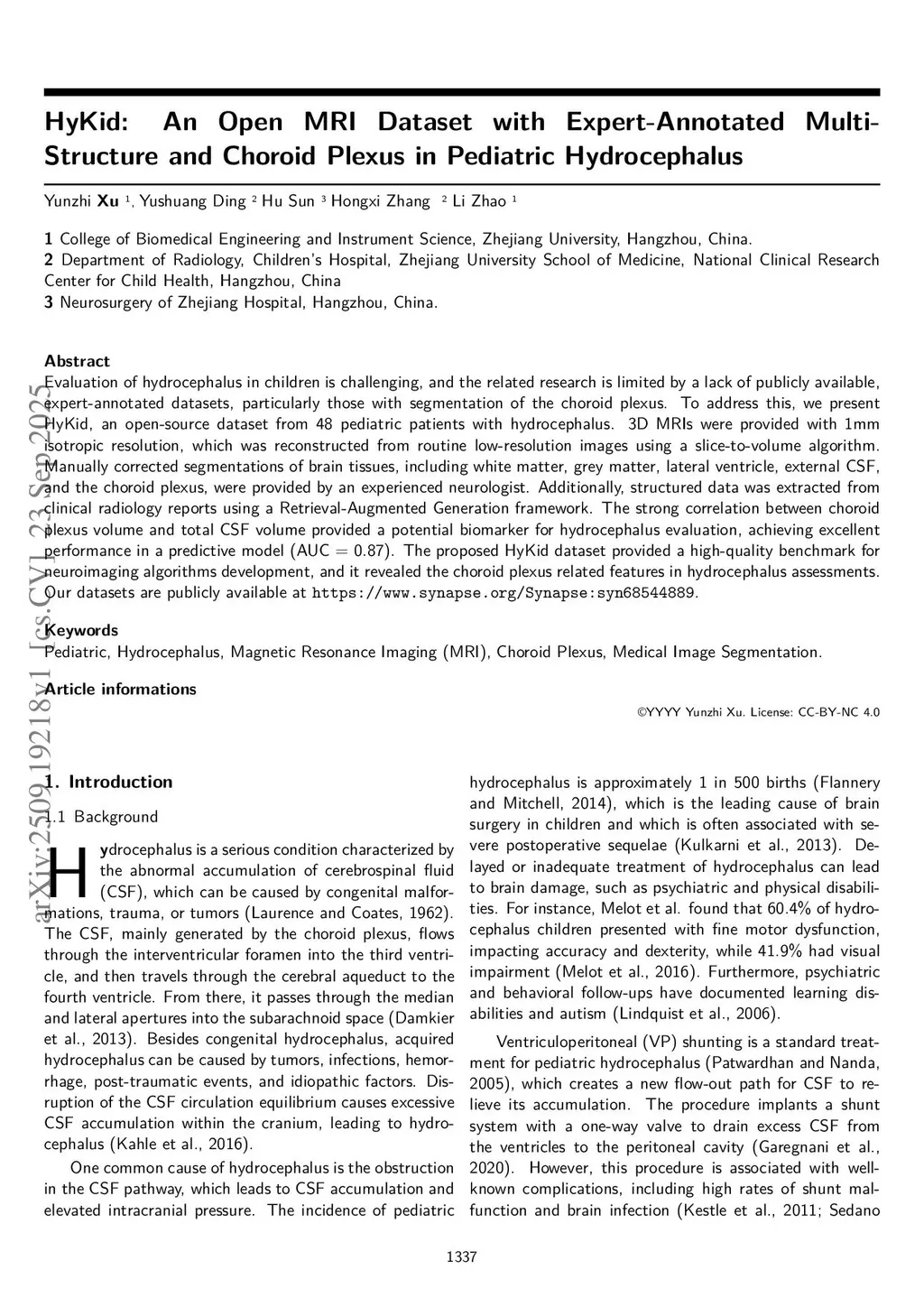 Evaluation of hydrocephalus in children is challenging, and the related research is limited by a lack of publicly available, expert-annotated datasets, particularly those with segmentation of the choroid plexus. To address this, we present HyKid, an open-source dataset from 48 pediatric patients with hydrocephalus. 3D MRIs were provided with 1mm isotropic resolution, which was reconstructed from routine low-resolution images using a slice-to-volume algorithm. Manually corrected segmentations of brain tissues, including white matter, grey matter, lateral ventricle, external CSF, and the choroid plexus, were provided by an experienced neurologist. Additionally, structured data was extracted from clinical radiology reports using a Retrieval-Augmented Generation framework. The strong correlation between choroid plexus volume and total CSF volume provided a potential biomarker for hydrocephalus evaluation, achieving excellent performance in a predictive model (AUC = 0.87). The proposed HyKid dataset provided a high-quality benchmark for neuroimaging algorithms development, and it revealed the choroid plexus-related features in hydrocephalus assessments. Our datasets are publicly available atthis https URL.
