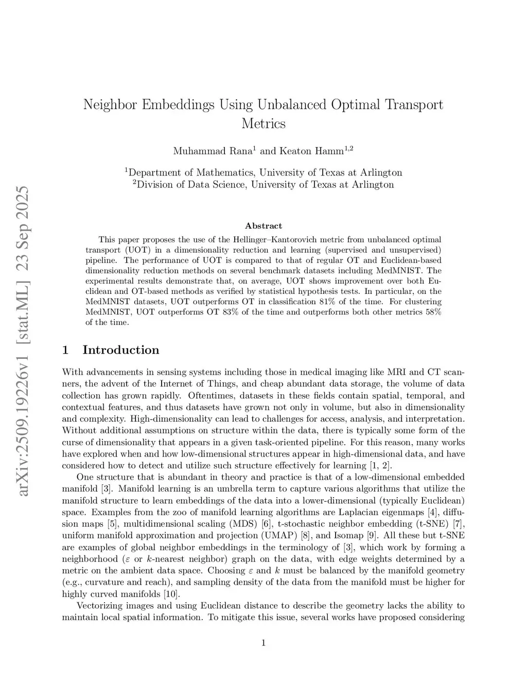 This paper proposes the use of the Hellinger--Kantorovich metric from unbalanced optimal transport (UOT) in a dimensionality reduction and learning (supervised and unsupervised) pipeline. The performance of UOT is compared to that of regular OT and Euclidean-based dimensionality reduction methods on several benchmark datasets including MedMNIST. The experimental results demonstrate that, on average, UOT shows improvement over both Euclidean and OT-based methods as verified by statistical hypothesis tests. In particular, on the MedMNIST datasets, UOT outperforms OT in classification 81\% of the time. For clustering MedMNIST, UOT outperforms OT 83\% of the time and outperforms both other metrics 58\% of the time.