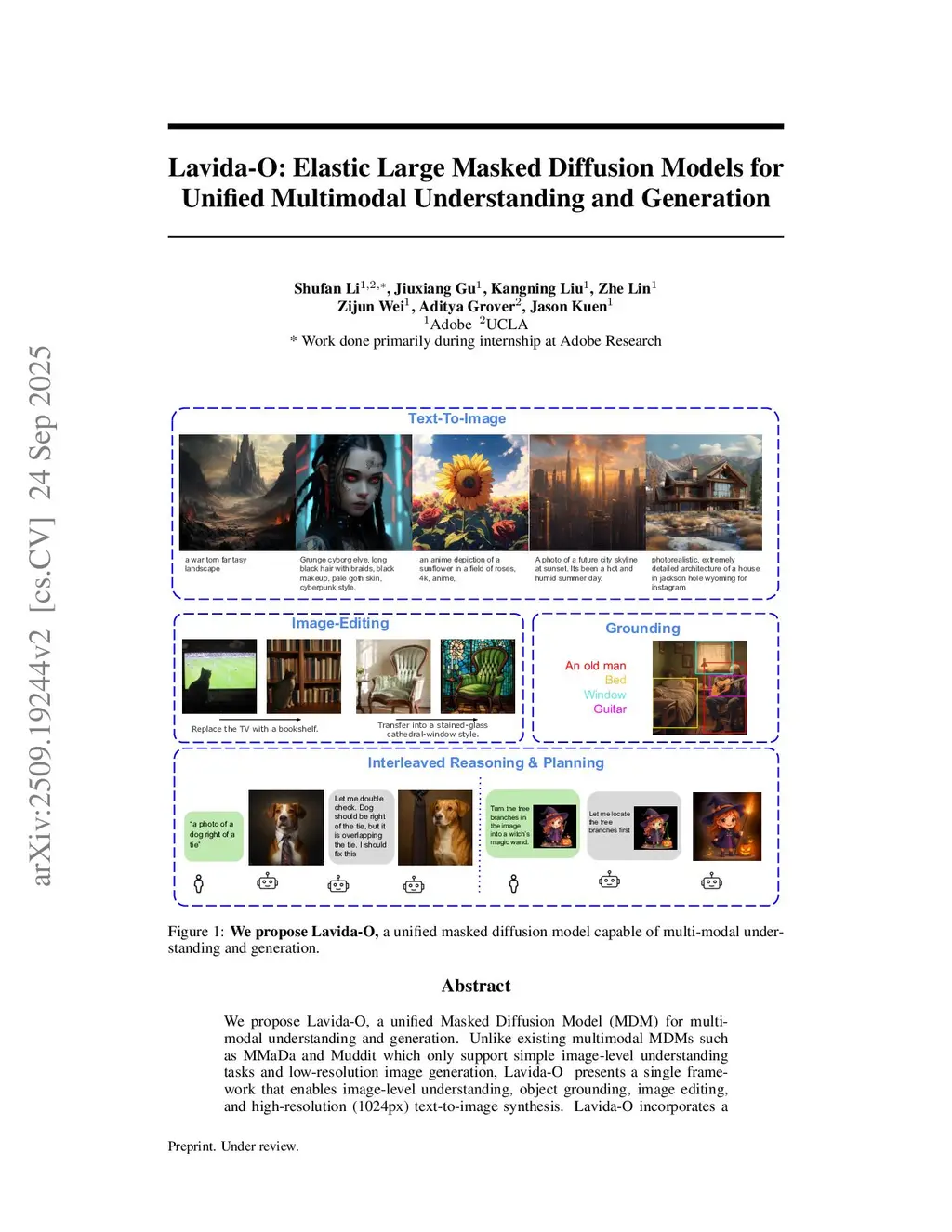 We propose Lavida-O, a unified Masked Diffusion Model (MDM) for multimodal understanding and generation. Unlike existing multimodal MDMs such as MMaDa and Muddit which only support simple image-level understanding tasks and low-resolution image generation, Lavida-O presents a single framework that enables image-level understanding, object grounding, image editing, and high-resolution (1024px) text-to-image synthesis. Lavida-O incorporates a novel Elastic Mixture-of-Transformers (Elastic-MoT) architecture that couples a lightweight generation branch with a larger understanding branch, supported by token compression, universal text conditioning and stratified sampling for efficient and high-quality generation. Lavida-O further incorporates planning and iterative self-reflection in image generation and editing tasks, seamlessly boosting generation quality with its understanding capabilities. Lavida-O achieves state-of-the-art performance on a wide range of benchmarks including RefCOCO object grounding, GenEval text-to-image generation, and ImgEdit image editing, outperforming existing autoregressive models and continuous diffusion models such as Qwen2.5-VL and FluxKontext-dev, while offering considerable speedup at inference. These advances establish Lavida-O as a new paradigm for scalable multimodal reasoning and generation.