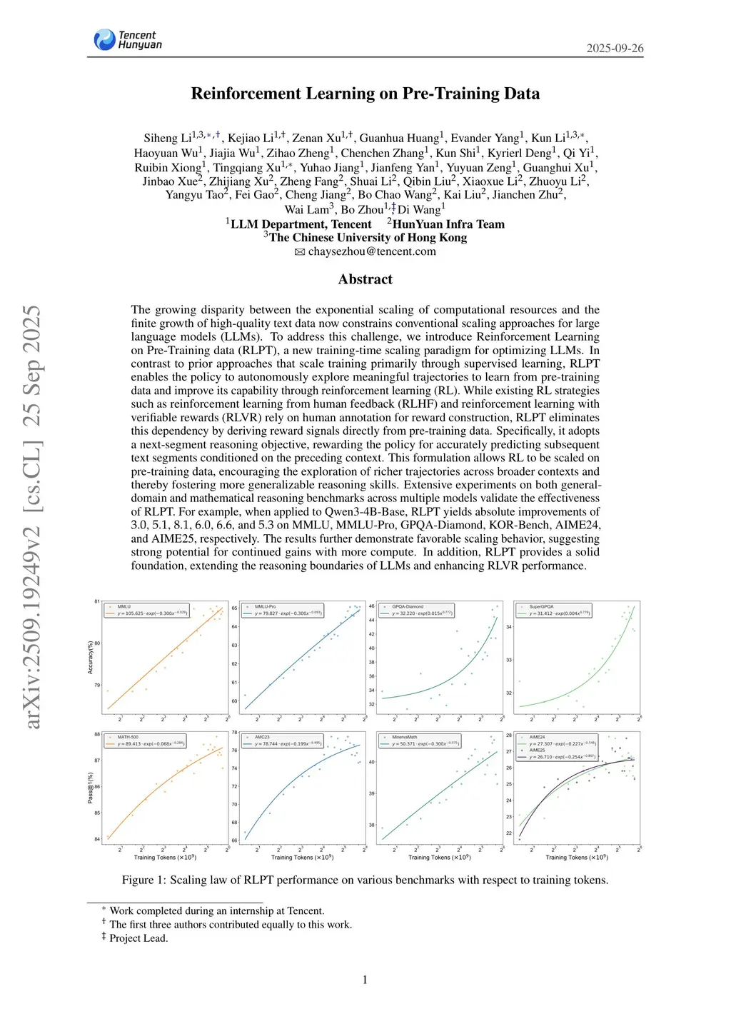 The growing disparity between the exponential scaling of computational resources and the finite growth of high-quality text data now constrains conventional scaling approaches for large language models (LLMs). To address this challenge, we introduce Reinforcement Learning on Pre-Training data (RLPT), a new training-time scaling paradigm for optimizing LLMs. In contrast to prior approaches that scale training primarily through supervised learning, RLPT enables the policy to autonomously explore meaningful trajectories to learn from pre-training data and improve its capability through reinforcement learning (RL). While existing RL strategies such as reinforcement learning from human feedback (RLHF) and reinforcement learning with verifiable rewards (RLVR) rely on human annotation for reward construction, RLPT eliminates this dependency by deriving reward signals directly from pre-training data. Specifically, it adopts a next-segment reasoning objective, rewarding the policy for accurately predicting subsequent text segments conditioned on the preceding context. This formulation allows RL to be scaled on pre-training data, encouraging the exploration of richer trajectories across broader contexts and thereby fostering more generalizable reasoning skills. Extensive experiments on both general-domain and mathematical reasoning benchmarks across multiple models validate the effectiveness of RLPT. For example, when applied to Qwen3-4B-Base, RLPT yields absolute improvements of , , , , , and on MMLU, MMLU-Pro, GPQA-Diamond, KOR-Bench, AIME24, and AIME25, respectively. The results further demonstrate favorable scaling behavior, suggesting strong potential for continued gains with more compute. In addition, RLPT provides a solid foundation, extending the reasoning boundaries of LLMs and enhancing RLVR performance.