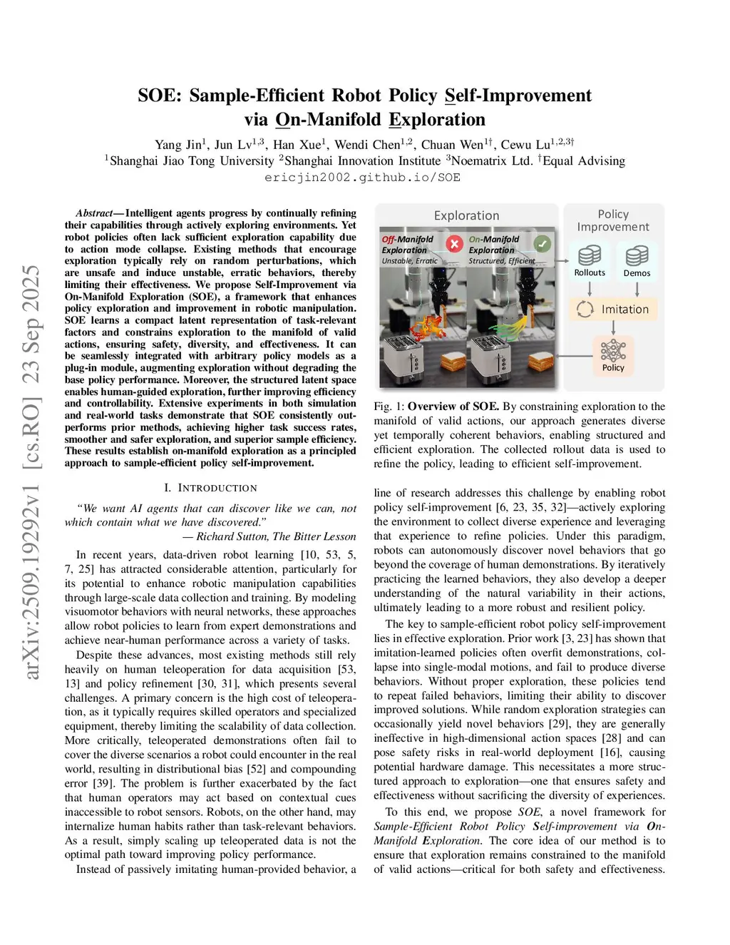 SOE: Sample-Efficient Robot Policy Self-Improvement via On-Manifold Exploration