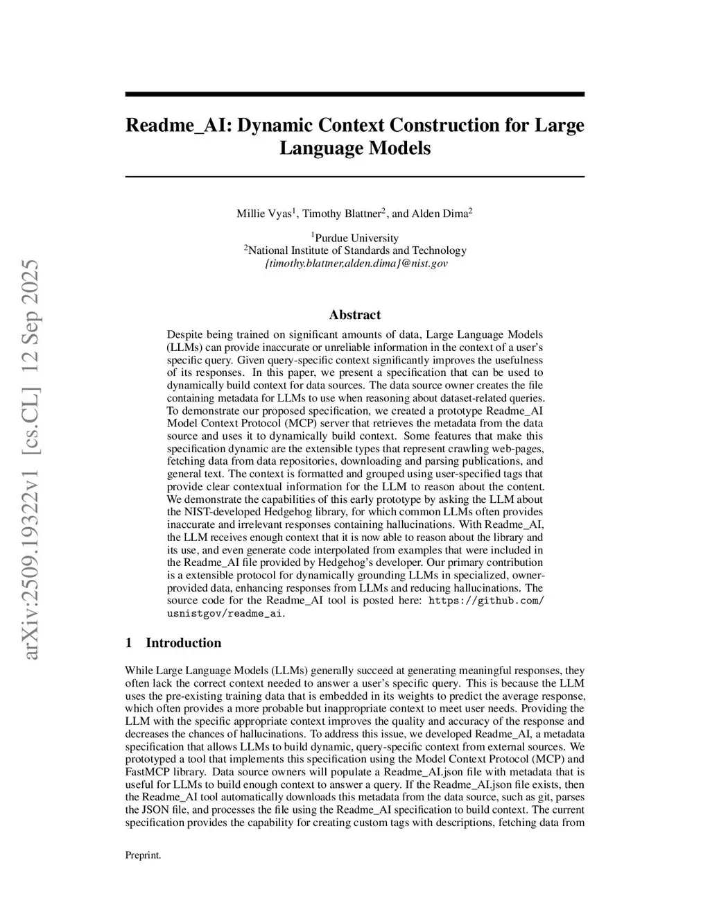 Despite being trained on significant amounts of data, Large Language Models (LLMs) can provide inaccurate or unreliable information in the context of a user's specific query. Given query-specific context significantly improves the usefulness of its responses. In this paper, we present a specification that can be used to dynamically build context for data sources. The data source owner creates the file containing metadata for LLMs to use when reasoning about dataset-related queries. To demonstrate our proposed specification, we created a prototype Readme_AI Model Context Protocol (MCP) server that retrieves the metadata from the data source and uses it to dynamically build context. Some features that make this specification dynamic are the extensible types that represent crawling web-pages, fetching data from data repositories, downloading and parsing publications, and general text. The context is formatted and grouped using user-specified tags that provide clear contextual information for the LLM to reason about the content. We demonstrate the capabilities of this early prototype by asking the LLM about the NIST-developed Hedgehog library, for which common LLMs often provides inaccurate and irrelevant responses containing hallucinations. With Readme_AI, the LLM receives enough context that it is now able to reason about the library and its use, and even generate code interpolated from examples that were included in the Readme_AI file provided by Hedgehog's developer. Our primary contribution is a extensible protocol for dynamically grounding LLMs in specialized, owner-provided data, enhancing responses from LLMs and reducing hallucinations. The source code for the Readme_AI tool is posted here:this https URL.