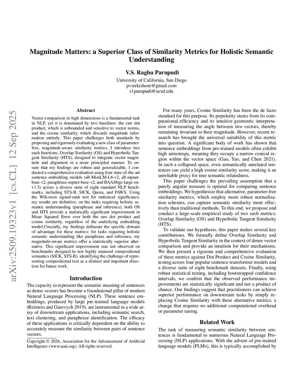 Vector comparison in high dimensions is a fundamental task in NLP, yet it is dominated by two baselines: the raw dot product, which is unbounded and sensitive to vector norms, and the cosine similarity, which discards magnitude information entirely. This paper challenges both standards by proposing and rigorously evaluating a new class of parameter-free, magnitude-aware similarity metrics. I introduce two such functions, Overlap Similarity (OS) and Hyperbolic Tangent Similarity (HTS), designed to integrate vector magnitude and alignment in a more principled manner. To ensure that my findings are robust and generalizable, I conducted a comprehensive evaluation using four state-of-the-art sentence embedding models (all-MiniLM-L6-v2, all-mpnet-base-v2, paraphrase-mpnet-base-v2, and BAAI/bge-large-en-v1.5) across a diverse suite of eight standard NLP benchmarks, including STS-B, SICK, Quora, and PAWS. Using the Wilcoxon signed-rank test for statistical significance, my results are definitive: on the tasks requiring holistic semantic understanding (paraphrase and inference), both OS and HTS provide a statistically significant improvement in Mean Squared Error over both the raw dot product and cosine similarity, regardless of the underlying embeddingthis http URL, my findings delineate the specific domain of advantage for these metrics: for tasks requiring holistic semantic understanding like paraphrase and inference, my magnitude-aware metrics offer a statistically superior alternative. This significant improvement was not observed on benchmarks designed to test highly nuanced compositional semantics (SICK, STS-B), identifying the challenge of representing compositional text as a distinct and important direction for future work.