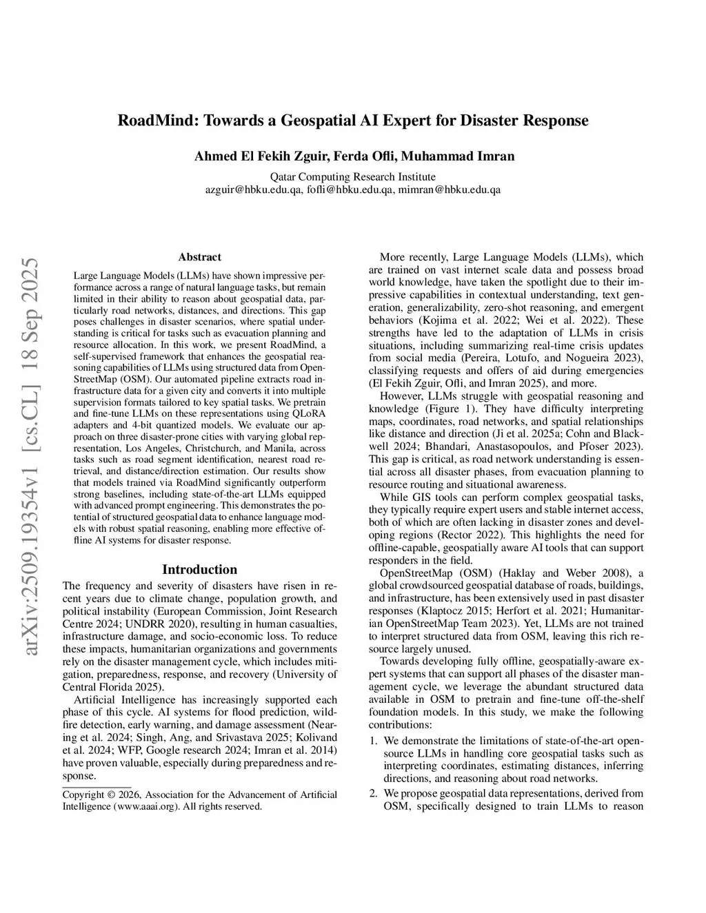 Large Language Models (LLMs) have shown impressive performance across a range of natural language tasks, but remain limited in their ability to reason about geospatial data, particularly road networks, distances, and directions. This gap poses challenges in disaster scenarios, where spatial understanding is critical for tasks such as evacuation planning and resource allocation. In this work, we present RoadMind, a self-supervised framework that enhances the geospatial reasoning capabilities of LLMs using structured data from OpenStreetMap (OSM). Our automated pipeline extracts road infrastructure data for a given city and converts it into multiple supervision formats tailored to key spatial tasks. We pretrain and fine-tune LLMs on these representations using QLoRA adapters and 4-bit quantized models. We evaluate our approach on three disaster-prone cities with varying global representation, Los Angeles, Christchurch, and Manila, across tasks such as road segment identification, nearest road retrieval, and distance/direction estimation. Our results show that models trained via RoadMind significantly outperform strong baselines, including state-of-the-art LLMs equipped with advanced prompt engineering. This demonstrates the potential of structured geospatial data to enhance language models with robust spatial reasoning, enabling more effective offline AI systems for disaster response.