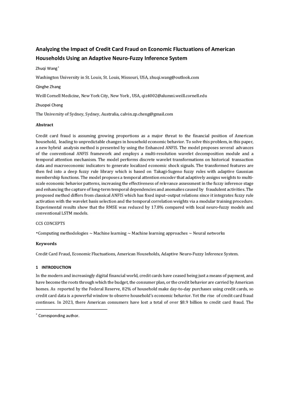 Credit card fraud is assuming growing proportions as a major threat to the financial position of American household, leading to unpredictable changes in household economic behavior. To solve this problem, in this paper, a new hybrid analysis method is presented by using the Enhanced ANFIS. The model proposes several advances of the conventional ANFIS framework and employs a multi-resolution wavelet decomposition module and a temporal attention mechanism. The model performs discrete wavelet transformations on historical transaction data and macroeconomic indicators to generate localized economic shock signals. The transformed features are then fed into a deep fuzzy rule library which is based on Takagi-Sugeno fuzzy rules with adaptive Gaussian membership functions. The model proposes a temporal attention encoder that adaptively assigns weights to multi-scale economic behavior patterns, increasing the effectiveness of relevance assessment in the fuzzy inference stage and enhancing the capture of long-term temporal dependencies and anomalies caused by fraudulent activities. The proposed method differs from classical ANFIS which has fixed input-output relations since it integrates fuzzy rule activation with the wavelet basis selection and the temporal correlation weights via a modular training procedure. Experimental results show that the RMSE was reduced by 17.8% compared with local neuro-fuzzy models and conventional LSTM models.