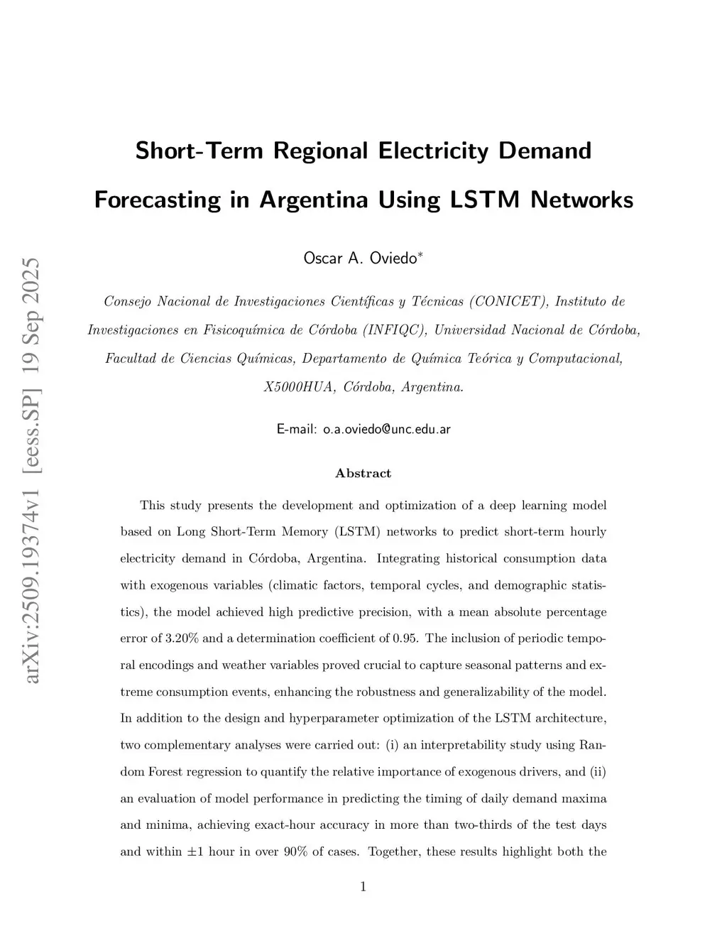 This study presents the development and optimization of a deep learning model based on Long Short-Term Memory (LSTM) networks to predict short-term hourly electricity demand in Córdoba, Argentina. Integrating historical consumption data with exogenous variables (climatic factors, temporal cycles, and demographic statistics), the model achieved high predictive precision, with a mean absolute percentage error of 3.20\% and a determination coefficient of 0.95. The inclusion of periodic temporal encodings and weather variables proved crucial to capture seasonal patterns and extreme consumption events, enhancing the robustness and generalizability of the model. In addition to the design and hyperparameter optimization of the LSTM architecture, two complementary analyses were carried out: (i) an interpretability study using Random Forest regression to quantify the relative importance of exogenous drivers, and (ii) an evaluation of model performance in predicting the timing of daily demand maxima and minima, achieving exact-hour accuracy in more than two-thirds of the test days and within abs(1) hour in over 90\% of cases. Together, these results highlight both the predictive accuracy and operational relevance of the proposed framework, providing valuable insights for grid operators seeking optimized planning and control strategies under diverse demand scenarios.