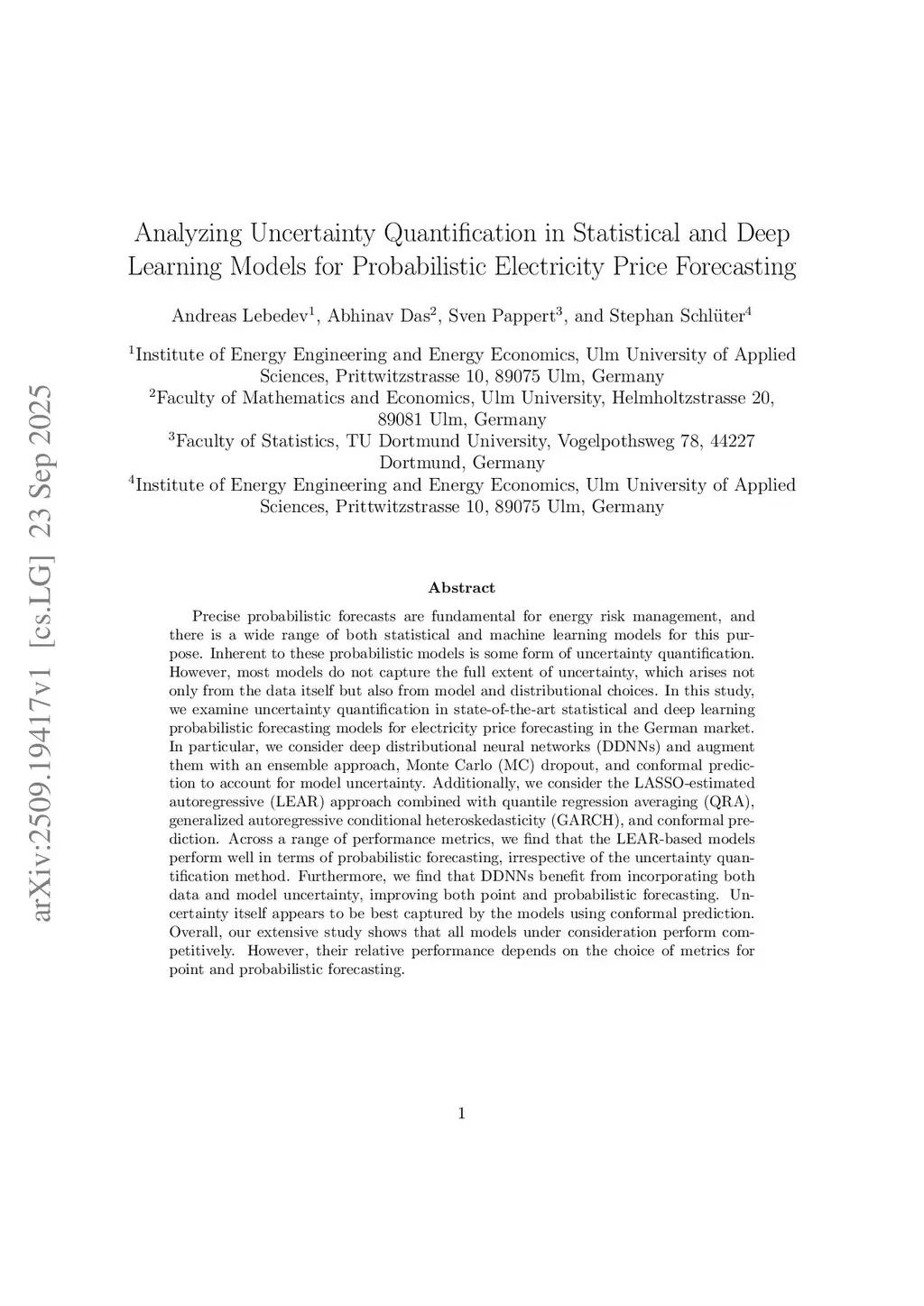 Precise probabilistic forecasts are fundamental for energy risk management, and there is a wide range of both statistical and machine learning models for this purpose. Inherent to these probabilistic models is some form of uncertainty quantification. However, most models do not capture the full extent of uncertainty, which arises not only from the data itself but also from model and distributional choices. In this study, we examine uncertainty quantification in state-of-the-art statistical and deep learning probabilistic forecasting models for electricity price forecasting in the German market. In particular, we consider deep distributional neural networks (DDNNs) and augment them with an ensemble approach, Monte Carlo (MC) dropout, and conformal prediction to account for model uncertainty. Additionally, we consider the LASSO-estimated autoregressive (LEAR) approach combined with quantile regression averaging (QRA), generalized autoregressive conditional heteroskedasticity (GARCH), and conformal prediction. Across a range of performance metrics, we find that the LEAR-based models perform well in terms of probabilistic forecasting, irrespective of the uncertainty quantification method. Furthermore, we find that DDNNs benefit from incorporating both data and model uncertainty, improving both point and probabilistic forecasting. Uncertainty itself appears to be best captured by the models using conformal prediction. Overall, our extensive study shows that all models under consideration perform competitively. However, their relative performance depends on the choice of metrics for point and probabilistic forecasting.
