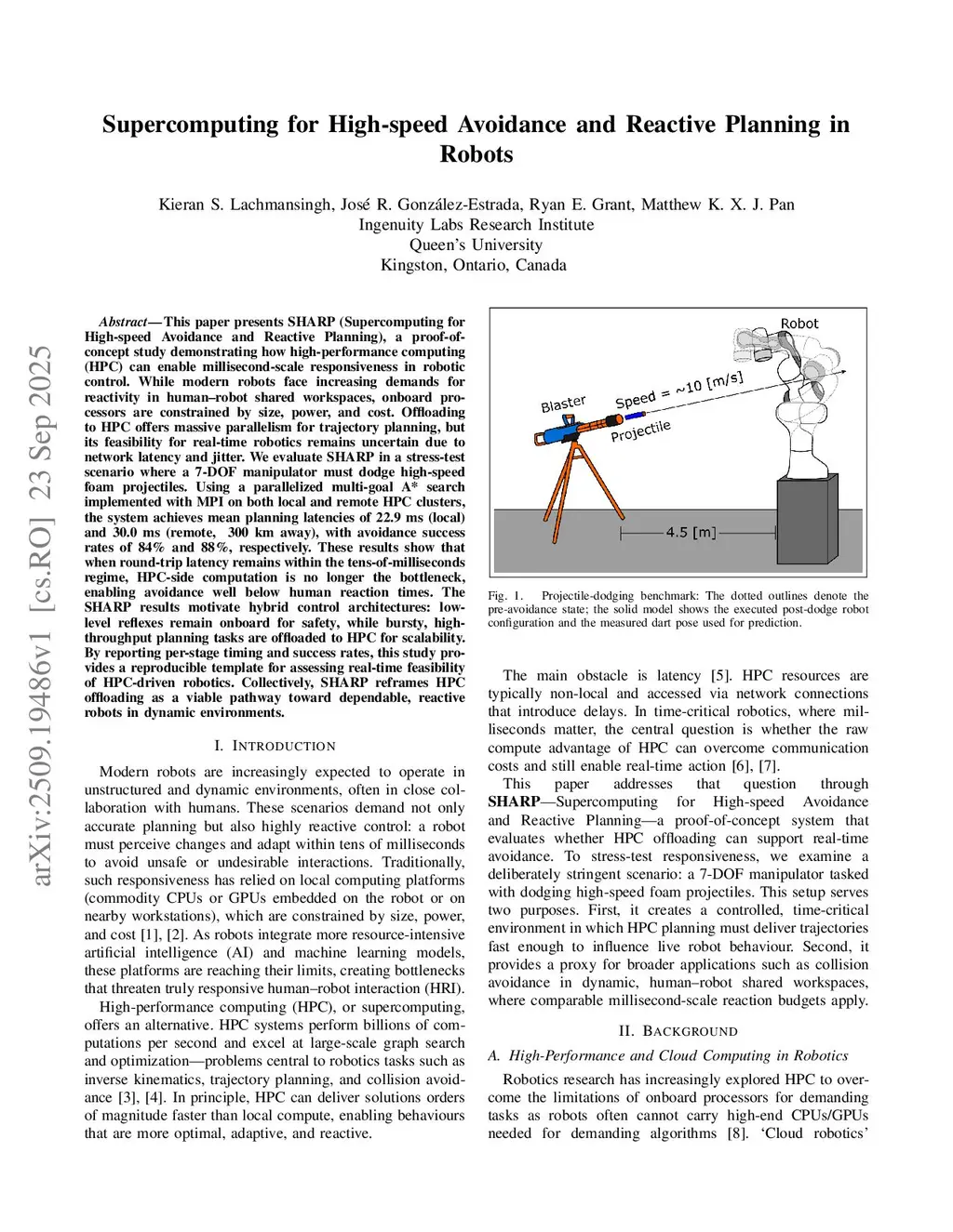 This paper presents SHARP (Supercomputing for High-speed Avoidance and Reactive Planning), a proof-of-concept study demonstrating how high-performance computing (HPC) can enable millisecond-scale responsiveness in robotic control. While modern robots face increasing demands for reactivity in human-robot shared workspaces, onboard processors are constrained by size, power, and cost. Offloading to HPC offers massive parallelism for trajectory planning, but its feasibility for real-time robotics remains uncertain due to network latency and jitter. We evaluate SHARP in a stress-test scenario where a 7-DOF manipulator must dodge high-speed foam projectiles. Using a hash-distributed multi-goal A* search implemented with MPI on both local and remote HPC clusters, the system achieves mean planning latencies of 22.9 ms (local) and 30.0 ms (remote, ~300 km away), with avoidance success rates of 84% and 88%, respectively. These results show that when round-trip latency remains within the tens-of-milliseconds regime, HPC-side computation is no longer the bottleneck, enabling avoidance well below human reaction times. The SHARP results motivate hybrid control architectures: low-level reflexes remain onboard for safety, while bursty, high-throughput planning tasks are offloaded to HPC for scalability. By reporting per-stage timing and success rates, this study provides a reproducible template for assessing real-time feasibility of HPC-driven robotics. Collectively, SHARP reframes HPC offloading as a viable pathway toward dependable, reactive robots in dynamic environments.