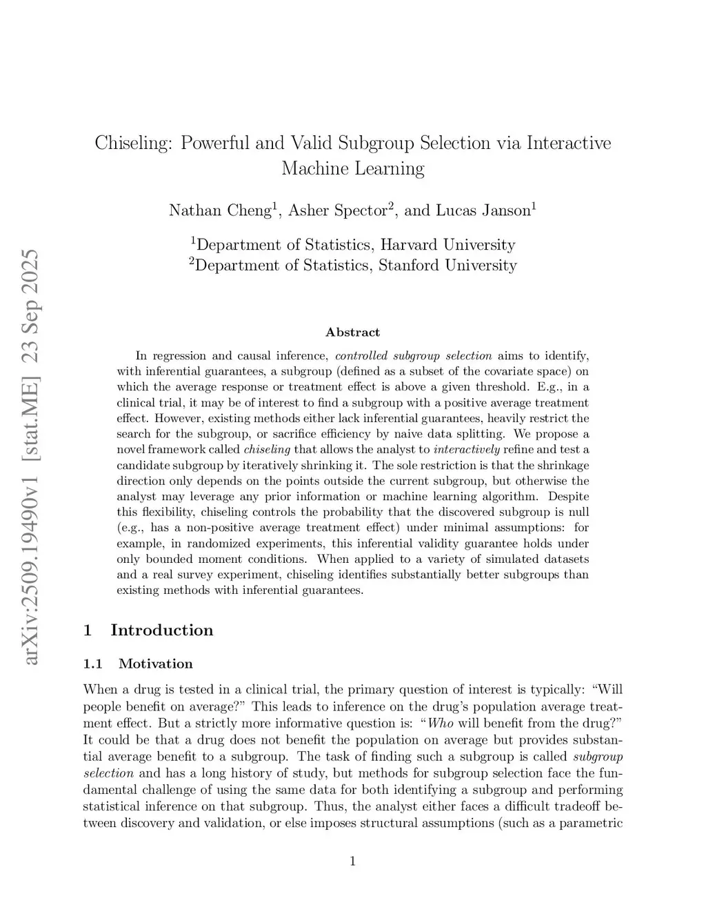 In regression and causal inference, controlled subgroup selection aims to identify, with inferential guarantees, a subgroup (defined as a subset of the covariate space) on which the average response or treatment effect is above a given threshold. E.g., in a clinical trial, it may be of interest to find a subgroup with a positive average treatment effect. However, existing methods either lack inferential guarantees, heavily restrict the search for the subgroup, or sacrifice efficiency by naive data splitting. We propose a novel framework called chiseling that allows the analyst to interactively refine and test a candidate subgroup by iteratively shrinking it. The sole restriction is that the shrinkage direction only depends on the points outside the current subgroup, but otherwise the analyst may leverage any prior information or machine learning algorithm. Despite this flexibility, chiseling controls the probability that the discovered subgroup is null (e.g., has a non-positive average treatment effect) under minimal assumptions: for example, in randomized experiments, this inferential validity guarantee holds under only bounded moment conditions. When applied to a variety of simulated datasets and a real survey experiment, chiseling identifies substantially better subgroups than existing methods with inferential guarantees.