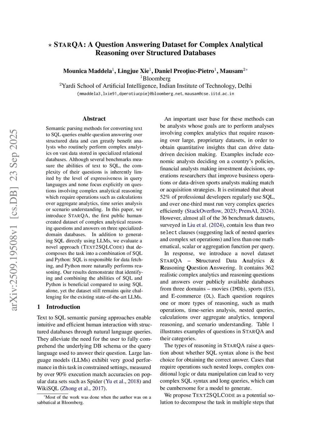 Semantic parsing methods for converting text to SQL queries enable question answering over structured data and can greatly benefit analysts who routinely perform complex analytics on vast data stored in specialized relational databases. Although several benchmarks measure the abilities of text to SQL, the complexity of their questions is inherently limited by the level of expressiveness in query languages and none focus explicitly on questions involving complex analytical reasoning which require operations such as calculations over aggregate analytics, time series analysis or scenario understanding. In this paper, we introduce STARQA, the first public human-created dataset of complex analytical reasoning questions and answers on three specialized-domain databases. In addition to generating SQL directly using LLMs, we evaluate a novel approach (Text2SQLCode) that decomposes the task into a combination of SQL and Python: SQL is responsible for data fetching, and Python more naturally performs reasoning. Our results demonstrate that identifying and combining the abilities of SQL and Python is beneficial compared to using SQL alone, yet the dataset still remains quite challenging for the existing state-of-the-art LLMs.