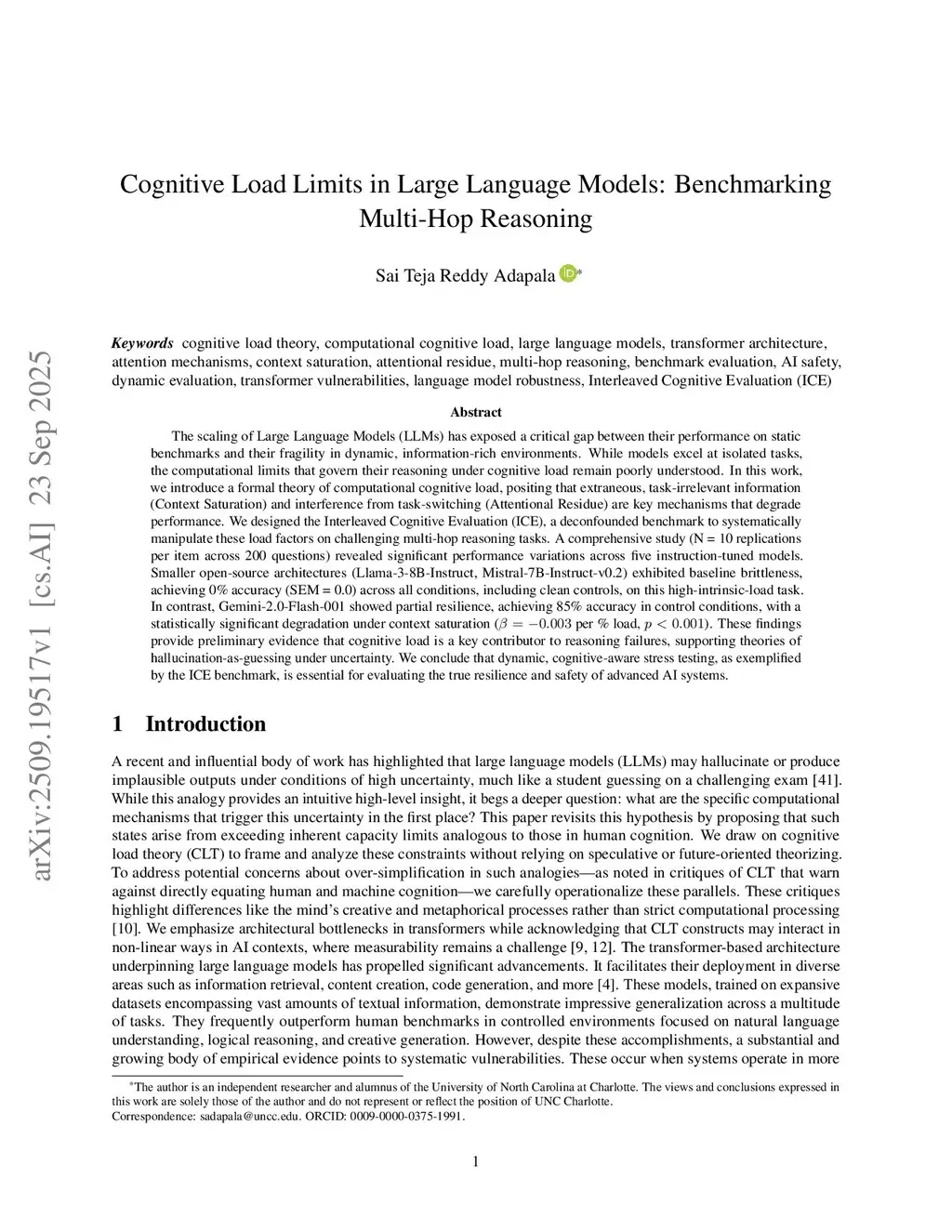 The scaling of Large Language Models (LLMs) has exposed a critical gap between their performance on static benchmarks and their fragility in dynamic, information-rich environments. While models excel at isolated tasks, the computational limits that govern their reasoning under cognitive load remain poorly understood. In this work, we introduce a formal theory of computational cognitive load, positing that extraneous, task-irrelevant information (Context Saturation) and interference from task-switching (Attentional Residue) are key mechanisms that degrade performance. We designed the Interleaved Cognitive Evaluation (ICE), a deconfounded benchmark to systematically manipulate these load factors on challenging multi-hop reasoning tasks. A comprehensive study (N = 10 replications per item across 200 questions) revealed significant performance variations across five instruction-tuned models. Smaller open-source architectures (Llama-3-8B-Instruct, Mistral-7B-Instruct-v0.2) exhibited baseline brittleness, achieving 0% accuracy (SEM = 0.0) across all conditions, including clean controls, on this high-intrinsic-load task. In contrast, Gemini-2.0-Flash-001 showed partial resilience, achieving 85% accuracy in control conditions, with a statistically significant degradation under context saturation ( per % load, ). These findings provide preliminary evidence that cognitive load is a key contributor to reasoning failures, supporting theories of hallucination-as-guessing under uncertainty. We conclude that dynamic, cognitive-aware stress testing, as exemplified by the ICE benchmark, is essential for evaluating the true resilience and safety of advanced AI systems.