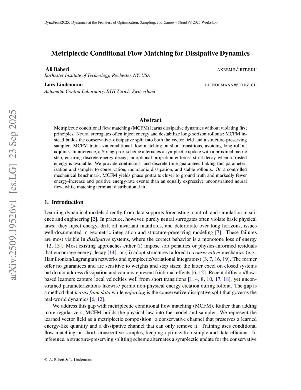 Metriplectic conditional flow matching (MCFM) learns dissipative dynamics without violating first principles. Neural surrogates often inject energy and destabilize long-horizon rollouts; MCFM instead builds the conservative-dissipative split into both the vector field and a structure preserving sampler. MCFM trains via conditional flow matching on short transitions, avoiding long rollout adjoints. In inference, a Strang-prox scheme alternates a symplectic update with a proximal metric step, ensuring discrete energy decay; an optional projection enforces strict decay when a trusted energy is available. We provide continuous and discrete time guarantees linking this parameterization and sampler to conservation, monotonic dissipation, and stable rollouts. On a controlled mechanical benchmark, MCFM yields phase portraits closer to ground truth and markedly fewer energy-increase and positive energy rate events than an equally expressive unconstrained neural flow, while matching terminal distributional fit.
