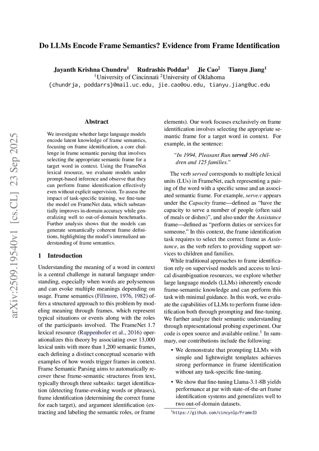 We investigate whether large language models encode latent knowledge of frame semantics, focusing on frame identification, a core challenge in frame semantic parsing that involves selecting the appropriate semantic frame for a target word in context. Using the FrameNet lexical resource, we evaluate models under prompt-based inference and observe that they can perform frame identification effectively even without explicit supervision. To assess the impact of task-specific training, we fine-tune the model on FrameNet data, which substantially improves in-domain accuracy while generalizing well to out-of-domain benchmarks. Further analysis shows that the models can generate semantically coherent frame definitions, highlighting the model's internalized understanding of frame semantics.