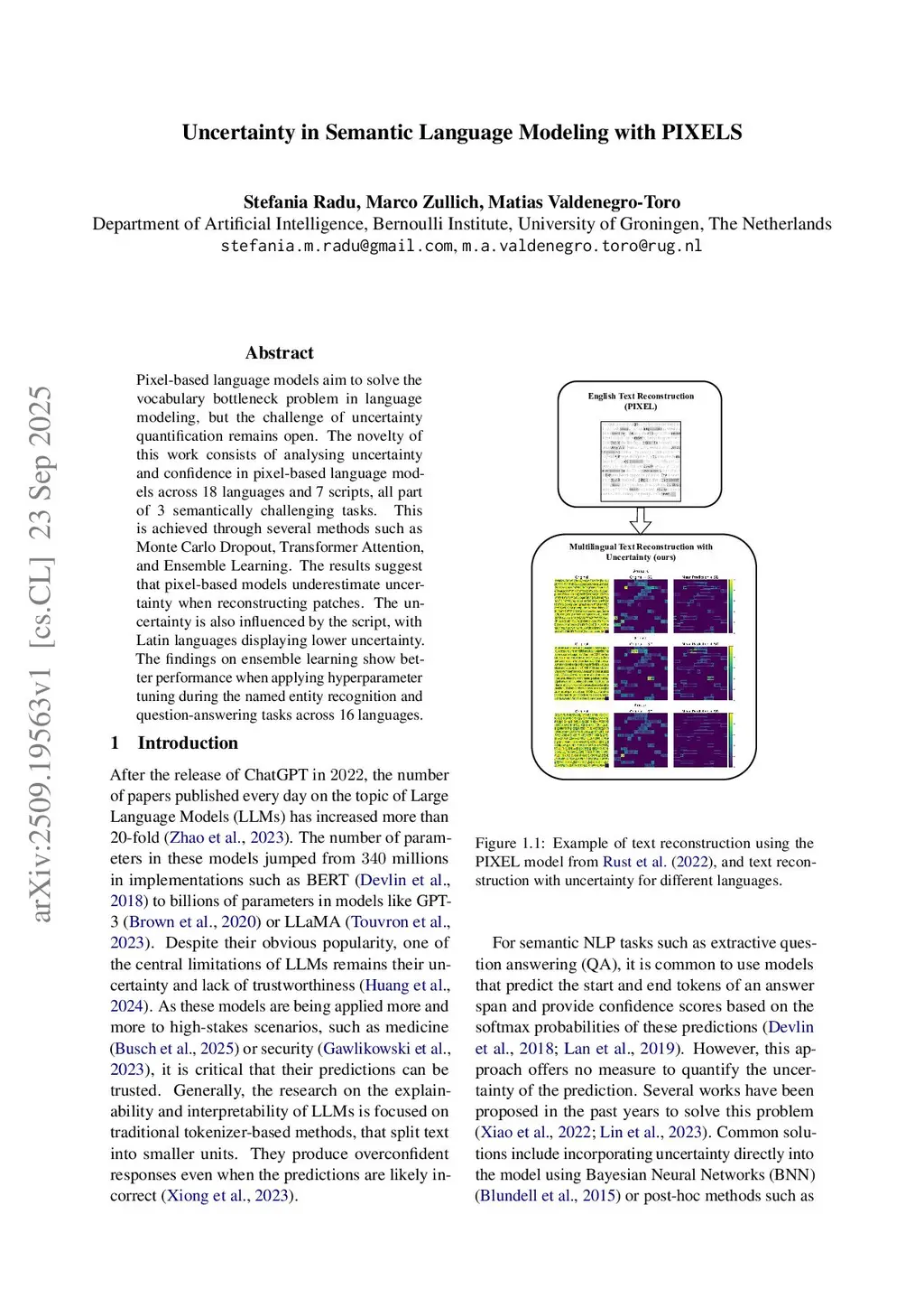 Pixel-based language models aim to solve the vocabulary bottleneck problem in language modeling, but the challenge of uncertainty quantification remains open. The novelty of this work consists of analysing uncertainty and confidence in pixel-based language models across 18 languages and 7 scripts, all part of 3 semantically challenging tasks. This is achieved through several methods such as Monte Carlo Dropout, Transformer Attention, and Ensemble Learning. The results suggest that pixel-based models underestimate uncertainty when reconstructing patches. The uncertainty is also influenced by the script, with Latin languages displaying lower uncertainty. The findings on ensemble learning show better performance when applying hyperparameter tuning during the named entity recognition and question-answering tasks across 16 languages.