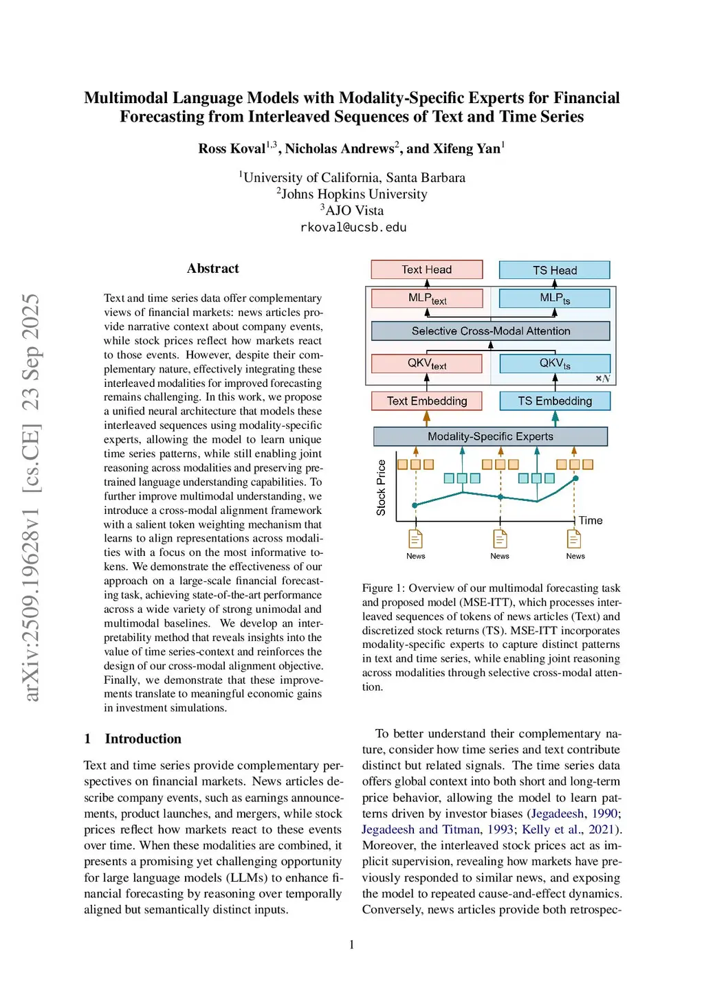 Text and time series data offer complementary views of financial markets: news articles provide narrative context about company events, while stock prices reflect how markets react to those events. However, despite their complementary nature, effectively integrating these interleaved modalities for improved forecasting remains challenging. In this work, we propose a unified neural architecture that models these interleaved sequences using modality-specific experts, allowing the model to learn unique time series patterns, while still enabling joint reasoning across modalities and preserving pretrained language understanding capabilities. To further improve multimodal understanding, we introduce a cross-modal alignment framework with a salient token weighting mechanism that learns to align representations across modalities with a focus on the most informative tokens. We demonstrate the effectiveness of our approach on a large-scale financial forecasting task, achieving state-of-the-art performance across a wide variety of strong unimodal and multimodal baselines. We develop an interpretability method that reveals insights into the value of time series-context and reinforces the design of our cross-modal alignment objective. Finally, we demonstrate that these improvements translate to meaningful economic gains in investment simulations.