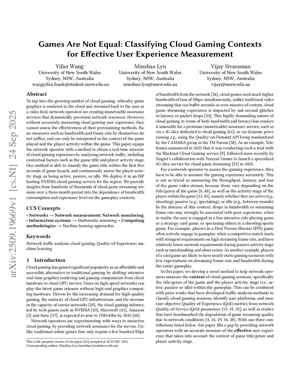 Games Are Not Equal: Classifying Cloud Gaming Contexts for Effective User Experience Measurement