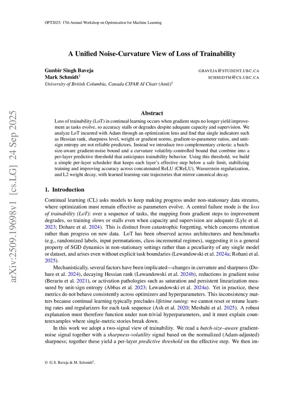 Loss of trainability refers to a phenomenon in continual learning where parameter updates no longer make progress on the optimization objective, so accuracy stalls or degrades as the learning problem changes over time. In this paper, we analyze loss of trainability through an optimization lens and find that the phenomenon is not reliably predicted by existing individual indicators such as Hessian rank, sharpness level, weight or gradient norms, gradient-to-parameter ratios, and unit-sign entropy. Motivated by our analysis, we introduce two complementary indicators: a batch-size-aware gradient-noise bound and a curvature volatility-controlled bound. We then combine these two indicators into a per-layer adaptive noise threshold on the effective step-size that anticipates trainability behavior. Using this insight, we propose a step-size scheduler that keeps each layer's effective parameter update below this bound, thereby avoiding loss of trainability. We demonstrate that our scheduler can improve the accuracy maintained by previously proposed approaches, such as concatenated ReLU (CReLU), Wasserstein regularizer, and L2 weight decay. Surprisingly, our scheduler produces adaptive step-size trajectories that, without tuning, mirror the manually engineered step-size decay schedules.