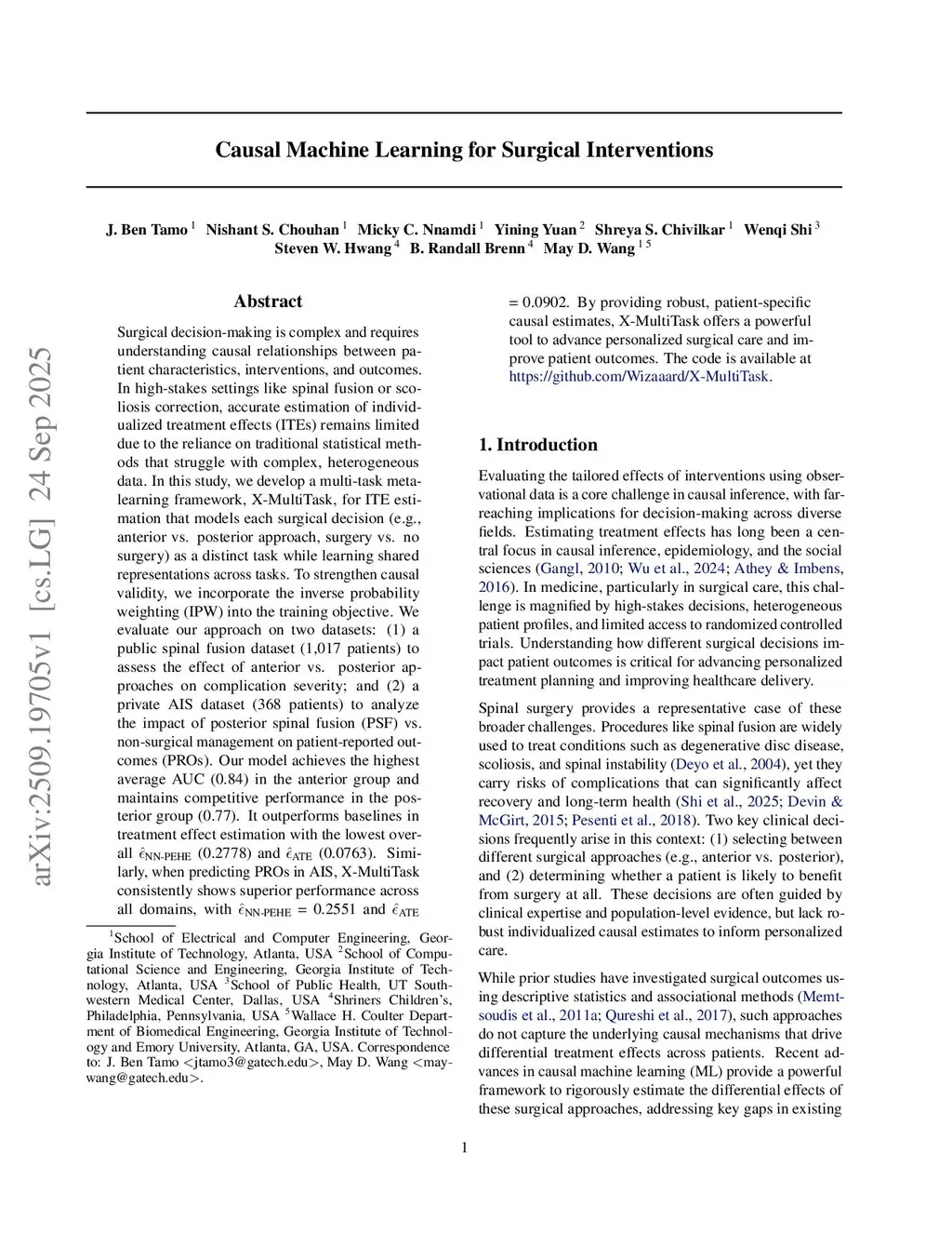 Surgical decision-making is complex and requires understanding causal relationships between patient characteristics, interventions, and outcomes. In high-stakes settings like spinal fusion or scoliosis correction, accurate estimation of individualized treatment effects (ITEs) remains limited due to the reliance on traditional statistical methods that struggle with complex, heterogeneous data. In this study, we develop a multi-task meta-learning framework, X-MultiTask, for ITE estimation that models each surgical decision (e.g., anterior vs. posterior approach, surgery vs. no surgery) as a distinct task while learning shared representations across tasks. To strengthen causal validity, we incorporate the inverse probability weighting (IPW) into the training objective. We evaluate our approach on two datasets: (1) a public spinal fusion dataset (1,017 patients) to assess the effect of anterior vs. posterior approaches on complication severity; and (2) a private AIS dataset (368 patients) to analyze the impact of posterior spinal fusion (PSF) vs. non-surgical management on patient-reported outcomes (PROs). Our model achieves the highest average AUC (0.84) in the anterior group and maintains competitive performance in the posterior group (0.77). It outperforms baselines in treatment effect estimation with the lowest overall (0.2778) and (0.0763). Similarly, when predicting PROs in AIS, X-MultiTask consistently shows superior performance across all domains, with = 0.2551 and = 0.0902. By providing robust, patient-specific causal estimates, X-MultiTask offers a powerful tool to advance personalized surgical care and improve patient outcomes. The code is available atthis https URL.