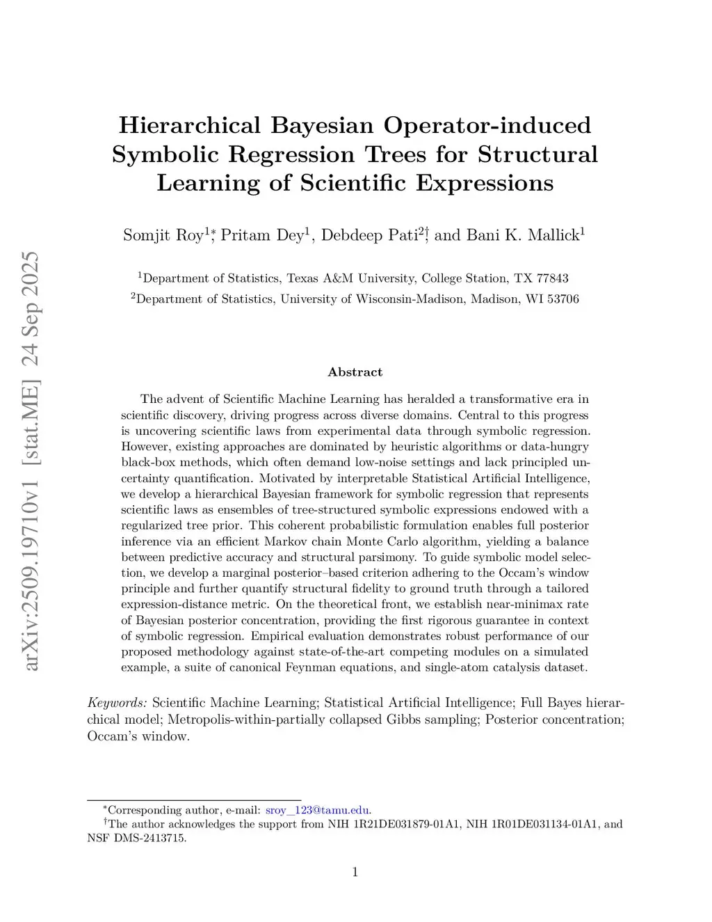The advent of Scientific Machine Learning has heralded a transformative era in scientific discovery, driving progress across diverse domains. Central to this progress is uncovering scientific laws from experimental data through symbolic regression. However, existing approaches are dominated by heuristic algorithms or data-hungry black-box methods, which often demand low-noise settings and lack principled uncertainty quantification. Motivated by interpretable Statistical Artificial Intelligence, we develop a hierarchical Bayesian framework for symbolic regression that represents scientific laws as ensembles of tree-structured symbolic expressions endowed with a regularized tree prior. This coherent probabilistic formulation enables full posterior inference via an efficient Markov chain Monte Carlo algorithm, yielding a balance between predictive accuracy and structural parsimony. To guide symbolic model selection, we develop a marginal posterior-based criterion adhering to the Occam's window principle and further quantify structural fidelity to ground truth through a tailored expression-distance metric. On the theoretical front, we establish near-minimax rate of Bayesian posterior concentration, providing the first rigorous guarantee in context of symbolic regression. Empirical evaluation demonstrates robust performance of our proposed methodology against state-of-the-art competing modules on a simulated example, a suite of canonical Feynman equations, and single-atom catalysis dataset.