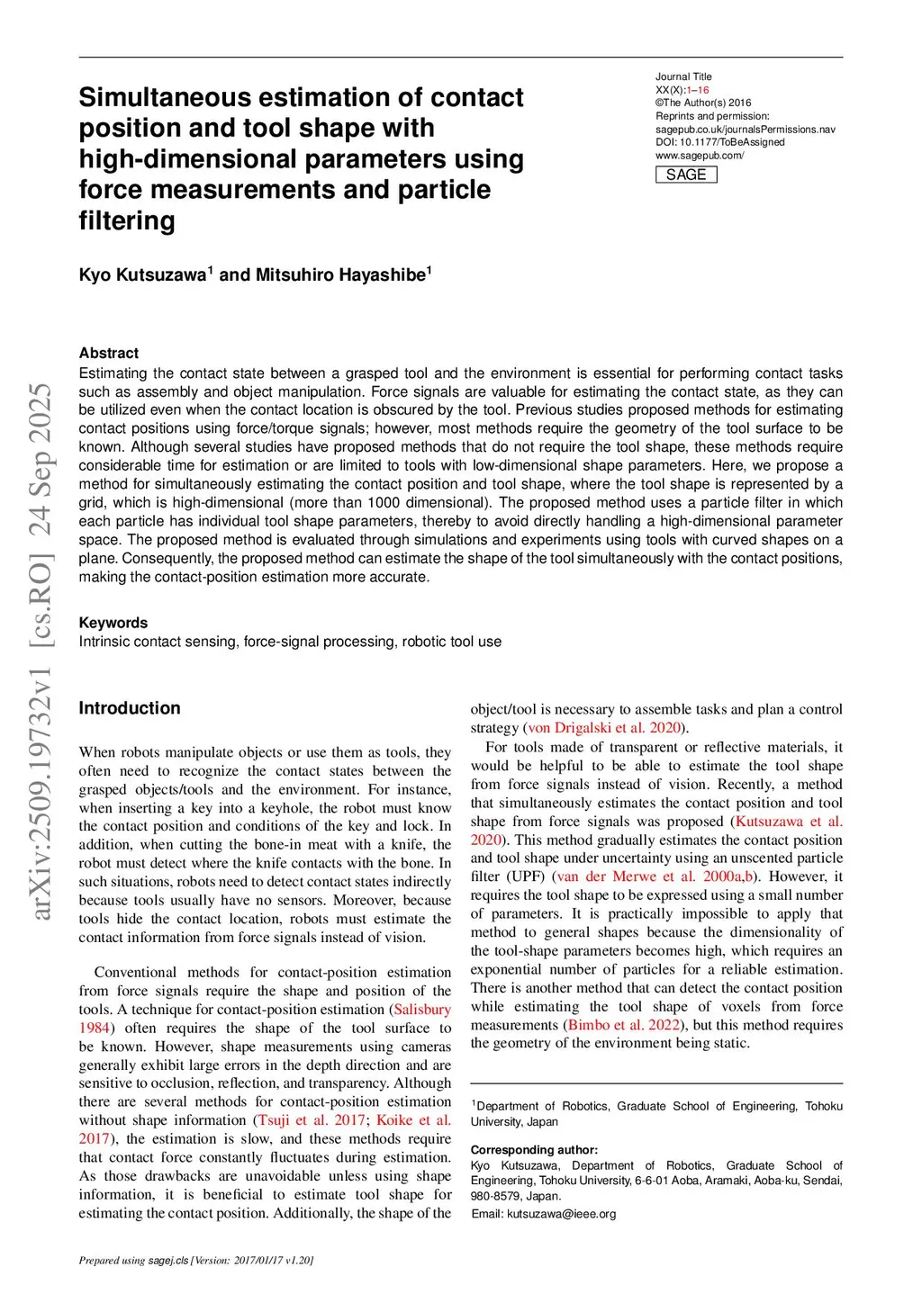 Simultaneous estimation of contact position and tool shape with high-dimensional parameters using force measurements and particle filtering