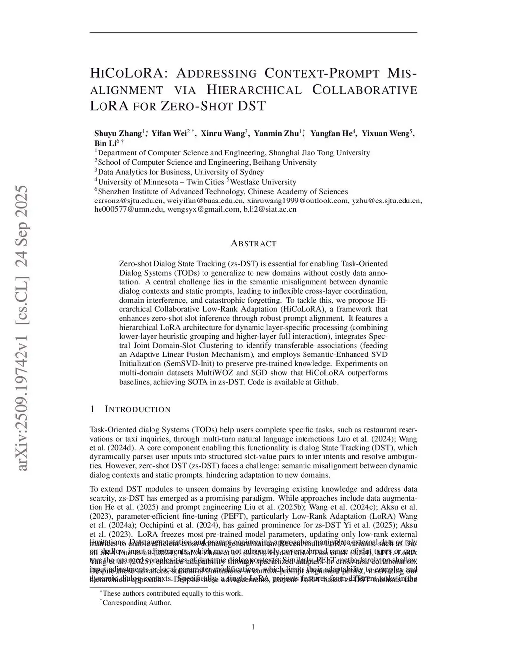 Zero-shot Dialog State Tracking (zs-DST) is essential for enabling Task-Oriented Dialog Systems (TODs) to generalize to new domains without costly data annotation. A central challenge lies in the semantic misalignment between dynamic dialog contexts and static prompts, leading to inflexible cross-layer coordination, domain interference, and catastrophic forgetting. To tackle this, we propose Hierarchical Collaborative Low-Rank Adaptation (HiCoLoRA), a framework that enhances zero-shot slot inference through robust prompt alignment. It features a hierarchical LoRA architecture for dynamic layer-specific processing (combining lower-layer heuristic grouping and higher-layer full interaction), integrates Spectral Joint Domain-Slot Clustering to identify transferable associations (feeding an Adaptive Linear Fusion Mechanism), and employs Semantic-Enhanced SVD Initialization (SemSVD-Init) to preserve pre-trained knowledge. Experiments on multi-domain datasets MultiWOZ and SGD show that HiCoLoRA outperforms baselines, achieving SOTA in zs-DST. Code is available atthis https URL.