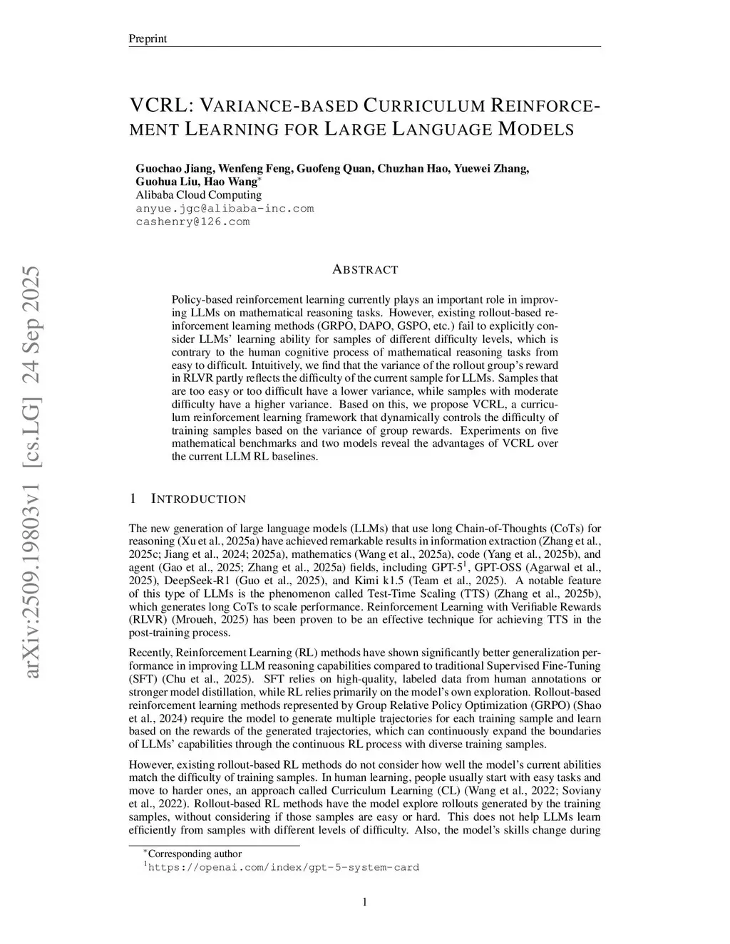 Policy-based reinforcement learning currently plays an important role in improving LLMs on mathematical reasoning tasks. However, existing rollout-based reinforcement learning methods (GRPO, DAPO, GSPO, etc.) fail to explicitly consider LLMs' learning ability for samples of different difficulty levels, which is contrary to the human cognitive process of mathematical reasoning tasks from easy to difficult. Intuitively, we find that the variance of the rollout group's reward in RLVR partly reflects the difficulty of the current sample for LLMs. Samples that are too easy or too difficult have a lower variance, while samples with moderate difficulty have a higher variance. Based on this, we propose VCRL, a curriculum reinforcement learning framework that dynamically controls the difficulty of training samples based on the variance of group rewards. Experiments on five mathematical benchmarks and two models reveal the advantages of VCRL over the current LLM RL baselines.