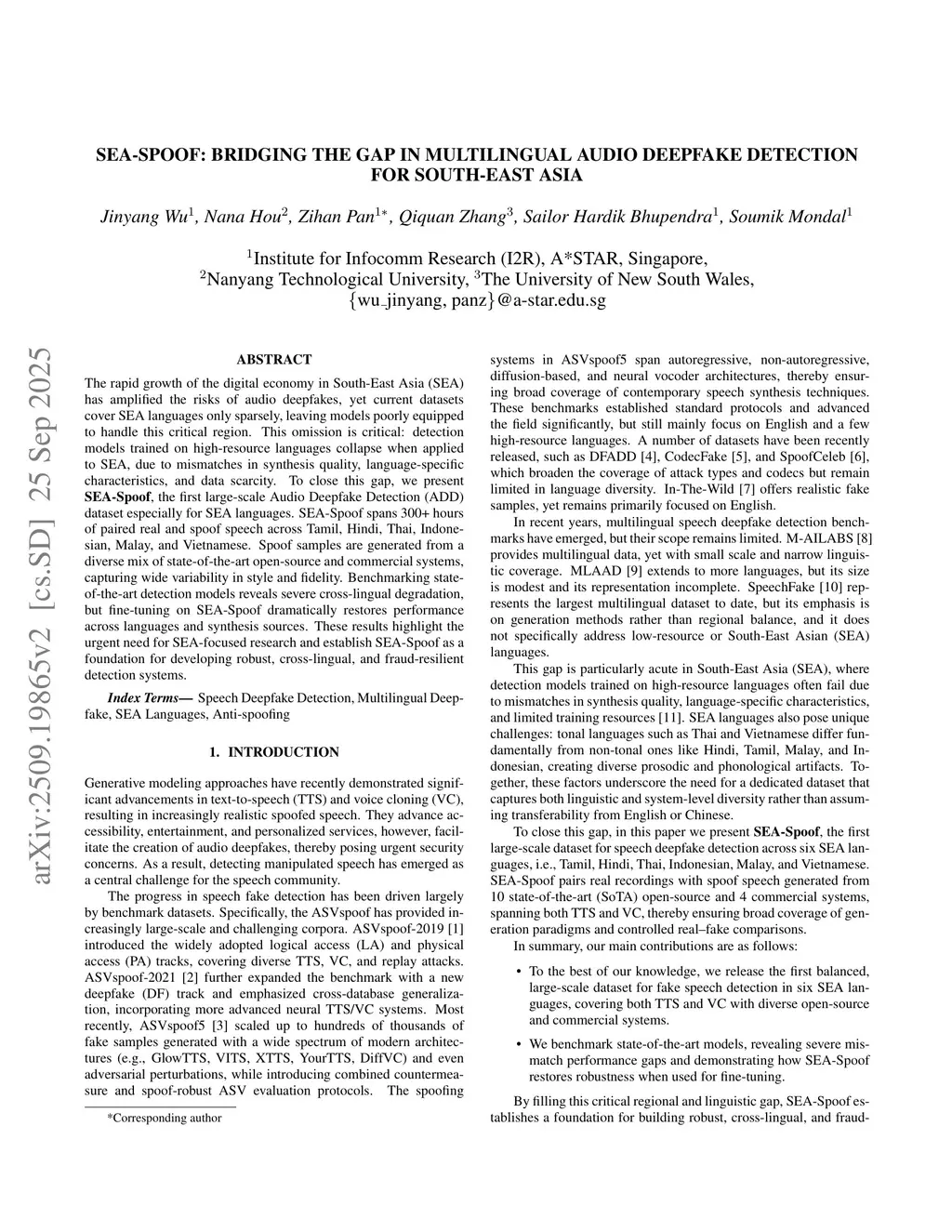 The rapid growth of the digital economy in South-East Asia (SEA) has amplified the risks of audio deepfakes, yet current datasets cover SEA languages only sparsely, leaving models poorly equipped to handle this critical region. This omission is critical: detection models trained on high-resource languages collapse when applied to SEA, due to mismatches in synthesis quality, language-specific characteristics, and data scarcity. To close this gap, we present SEA-Spoof, the first large-scale Audio Deepfake Detection (ADD) dataset especially for SEA languages. SEA-Spoof spans 300+ hours of paired real and spoof speech across Tamil, Hindi, Thai, Indonesian, Malay, and Vietnamese. Spoof samples are generated from a diverse mix of state-of-the-art open-source and commercial systems, capturing wide variability in style and fidelity. Benchmarking state-of-the-art detection models reveals severe cross-lingual degradation, but fine-tuning on SEA-Spoof dramatically restores performance across languages and synthesis sources. These results highlight the urgent need for SEA-focused research and establish SEA-Spoof as a foundation for developing robust, cross-lingual, and fraud-resilient detection systems.