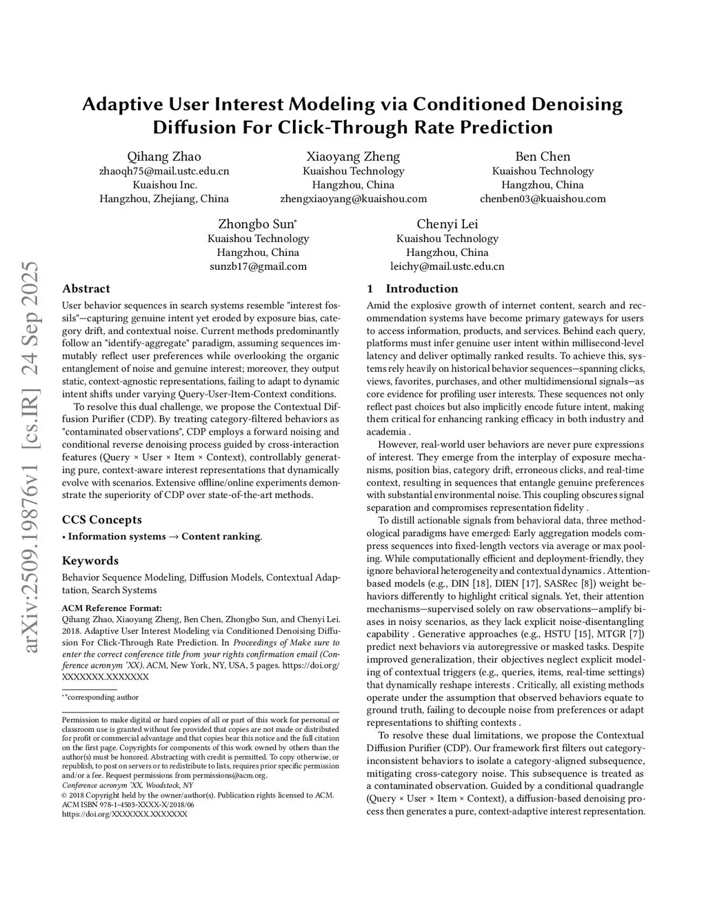 Adaptive User Interest Modeling via Conditioned Denoising Diffusion For Click-Through Rate Prediction