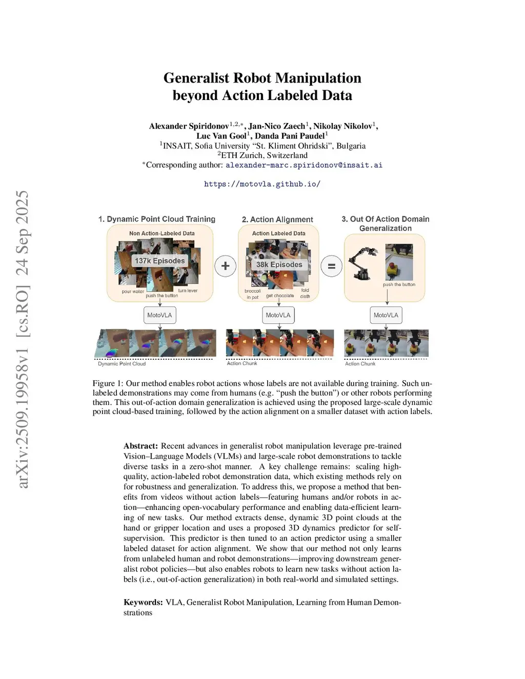 Recent advances in generalist robot manipulation leverage pre-trained Vision-Language Models (VLMs) and large-scale robot demonstrations to tackle diverse tasks in a zero-shot manner. A key challenge remains: scaling high-quality, action-labeled robot demonstration data, which existing methods rely on for robustness and generalization. To address this, we propose a method that benefits from videos without action labels - featuring humans and/or robots in action - enhancing open-vocabulary performance and enabling data-efficient learning of new tasks. Our method extracts dense, dynamic 3D point clouds at the hand or gripper location and uses a proposed 3D dynamics predictor for self-supervision. This predictor is then tuned to an action predictor using a smaller labeled dataset for action alignment. We show that our method not only learns from unlabeled human and robot demonstrations - improving downstream generalist robot policies - but also enables robots to learn new tasks without action labels (i.e., out-of-action generalization) in both real-world and simulated settings.