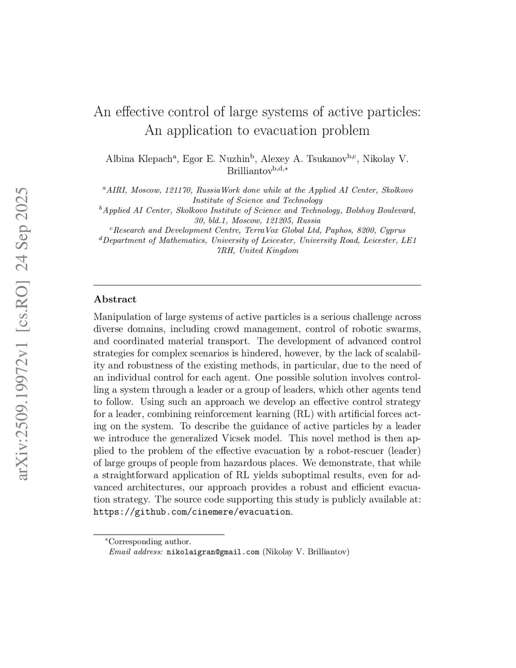 Manipulation of large systems of active particles is a serious challenge across diverse domains, including crowd management, control of robotic swarms, and coordinated material transport. The development of advanced control strategies for complex scenarios is hindered, however, by the lack of scalability and robustness of the existing methods, in particular, due to the need of an individual control for each agent. One possible solution involves controlling a system through a leader or a group of leaders, which other agents tend to follow. Using such an approach we develop an effective control strategy for a leader, combining reinforcement learning (RL) with artificial forces acting on the system. To describe the guidance of active particles by a leader we introduce the generalized Vicsek model. This novel method is then applied to the problem of the effective evacuation by a robot-rescuer (leader) of large groups of people from hazardous places. We demonstrate, that while a straightforward application of RL yields suboptimal results, even for advanced architectures, our approach provides a robust and efficient evacuation strategy. The source code supporting this study is publicly available at:this https URL.