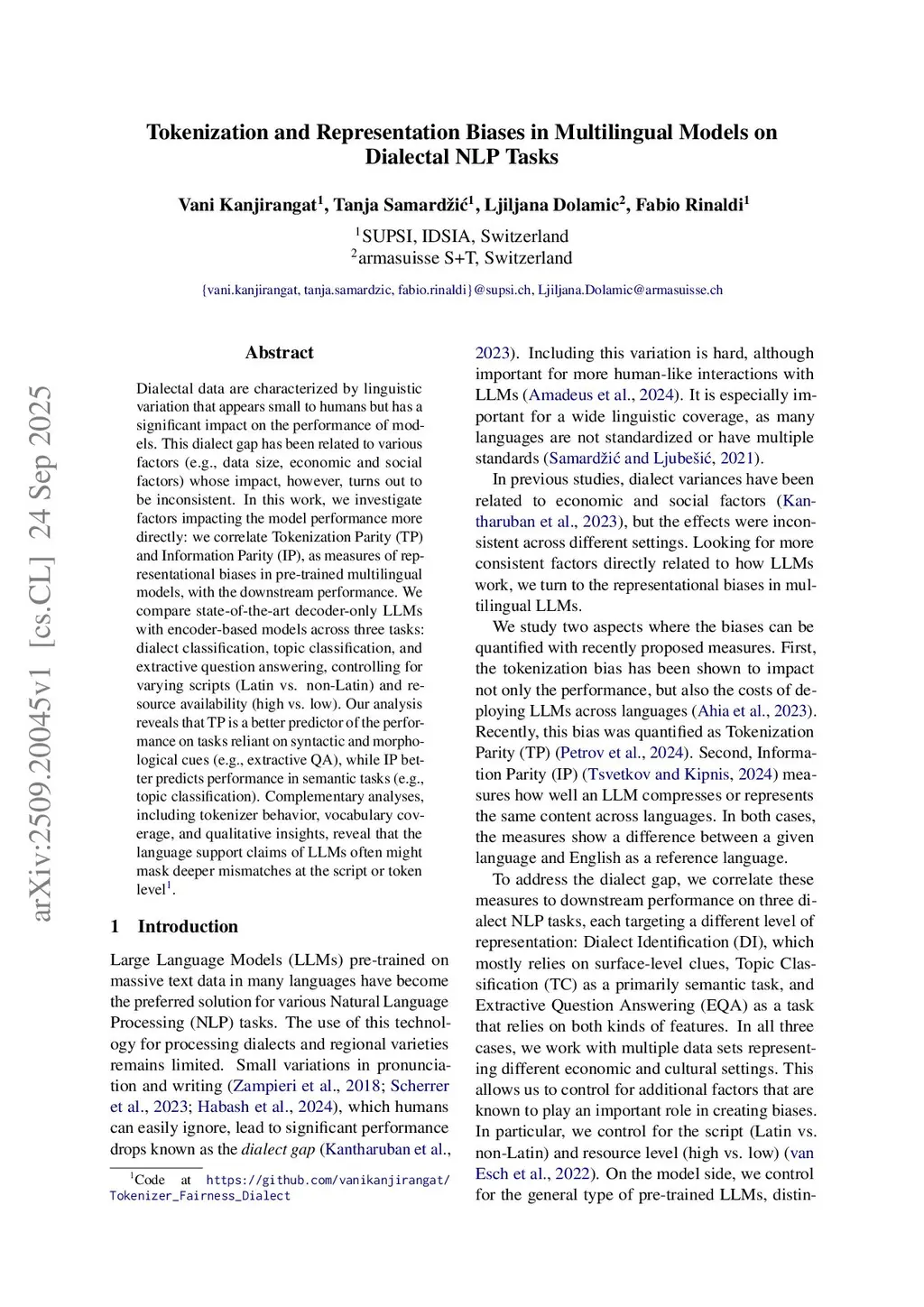 Dialectal data are characterized by linguistic variation that appears small to humans but has a significant impact on the performance of models. This dialect gap has been related to various factors (e.g., data size, economic and social factors) whose impact, however, turns out to be inconsistent. In this work, we investigate factors impacting the model performance more directly: we correlate Tokenization Parity (TP) and Information Parity (IP), as measures of representational biases in pre-trained multilingual models, with the downstream performance. We compare state-of-the-art decoder-only LLMs with encoder-based models across three tasks: dialect classification, topic classification, and extractive question answering, controlling for varying scripts (Latin vs. non-Latin) and resource availability (high vs. low). Our analysis reveals that TP is a better predictor of the performance on tasks reliant on syntactic and morphological cues (e.g., extractive QA), while IP better predicts performance in semantic tasks (e.g., topic classification). Complementary analyses, including tokenizer behavior, vocabulary coverage, and qualitative insights, reveal that the language support claims of LLMs often might mask deeper mismatches at the script or token level.