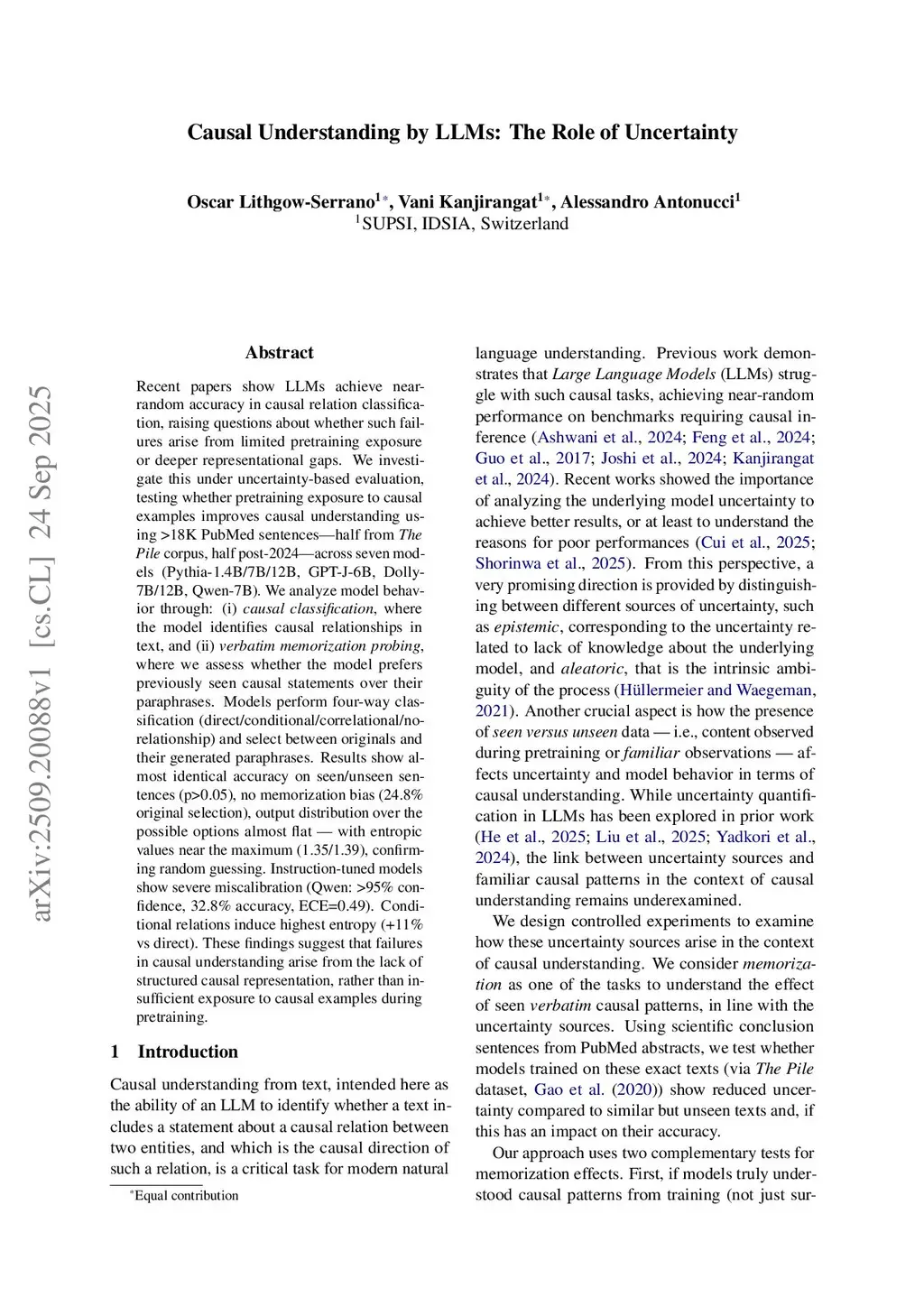 Recent papers show LLMs achieve near-random accuracy in causal relation classification, raising questions about whether such failures arise from limited pretraining exposure or deeper representational gaps. We investigate this under uncertainty-based evaluation, testing whether pretraining exposure to causal examples improves causal understanding >18K PubMed sentences -- half from The Pile corpus, half post-2024 -- across seven models (Pythia-1.4B/7B/12B, GPT-J-6B, Dolly-7B/12B, Qwen-7B). We analyze model behavior through: (i) causal classification, where the model identifies causal relationships in text, and (ii) verbatim memorization probing, where we assess whether the model prefers previously seen causal statements over their paraphrases. Models perform four-way classification (direct/conditional/correlational/no-relationship) and select between originals and their generated paraphrases. Results show almost identical accuracy on seen/unseen sentences (p > 0.05), no memorization bias (24.8% original selection), and output distribution over the possible options is almost flat, with entropic values near the maximum (1.35/1.39), confirming random guessing. Instruction-tuned models show severe miscalibration (Qwen: > 95% confidence, 32.8% accuracy, ECE=0.49). Conditional relations induce highest entropy (+11% vs. direct). These findings suggest that failures in causal understanding arise from the lack of structured causal representation, rather than insufficient exposure to causal examples during pretraining.